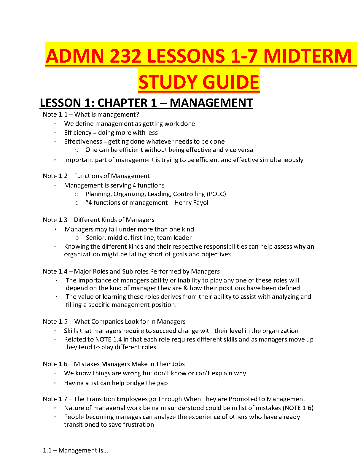 Admin 232 Lessons 1-7 Midterm Study Guide: Management - 2024/2025 Edition - By [Complete Authors' Names]