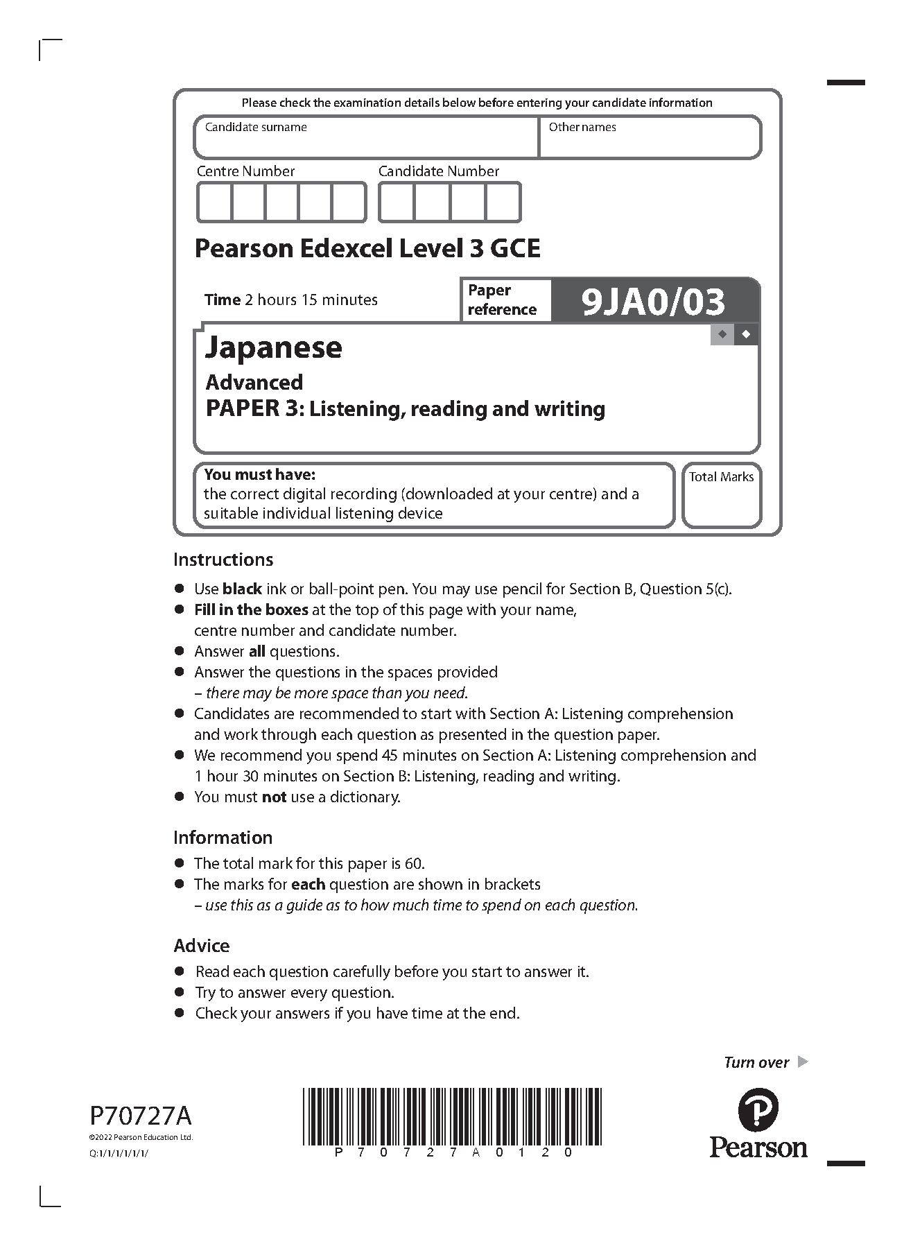 Pearson Edexcel Level 3 GCE Advanced Japanese Paper 3: Listening, reading and writing (2024/2025) - Ace your Exam on the First Try!