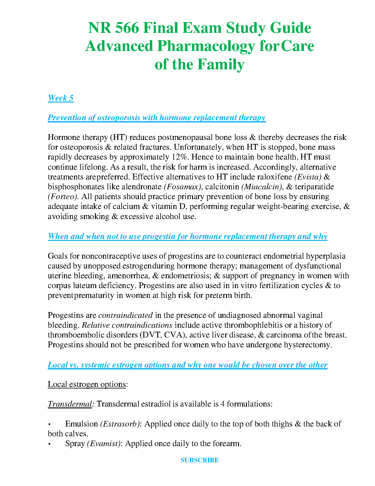 This comprehensive study guide covers the key concepts in advanced pharmacology for care of the family, specifically designed to help you ace your NR 566 final exam, with a focus on prevention of osteoporosis with hormone replacement therapy and contraindications of progestins, local and systemic estrogen options, as well as the rationales behind each option.