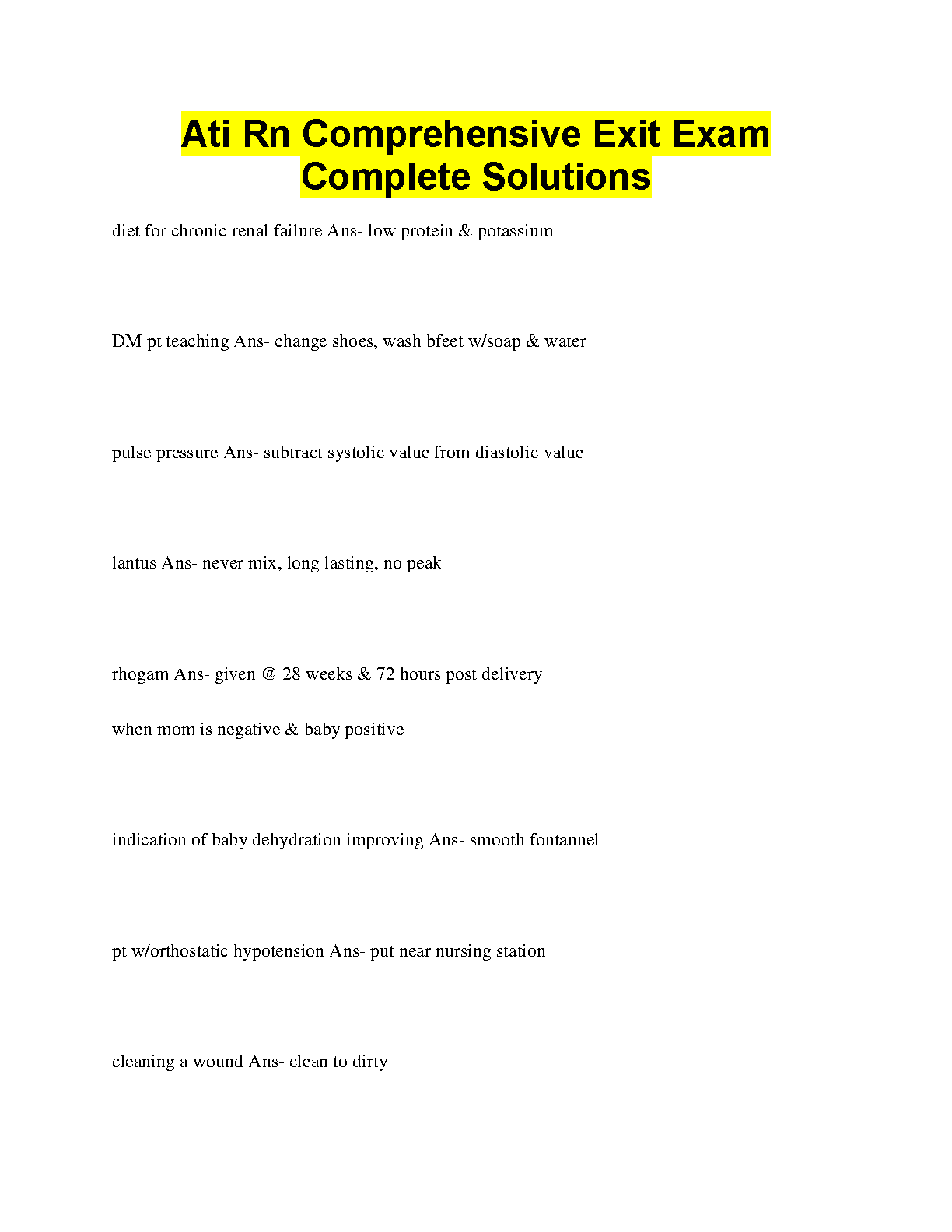 Ace your ATI RN Comprehensive Exit Exam with our comprehensive study guide and solution manual. This resource covers all the essential topics you need to know, including medication administration, medical-surgical nursing, and critical care. Get a head start on your nursing career and avoid resits!