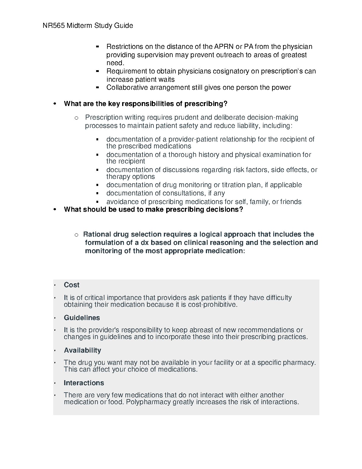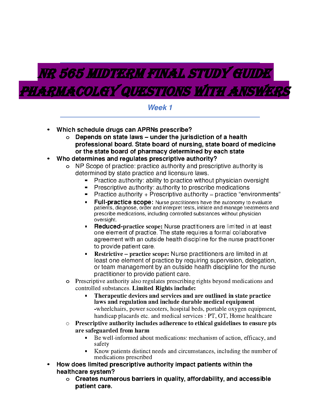 This NR 565 study guide focuses on pharmacology questions with answers, covering topics including schedule drugs, prescriptive authority, and the impact of limited prescriptive authority on patient care. It is designed to help students pass their exams on the first attempt, avoiding any resits.