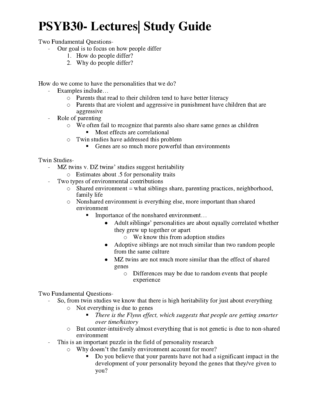 This detailed study guide provides a thorough exploration of the fundamental questions surrounding human personality. It delves into the fascinating world of twin studies, analyzing the influence of genetics and environment on personality traits. With insightful discussions on the Flynn effect and the role of non-shared environments, this guide equips students with the knowledge to excel in their studies and gain a deeper understanding of human behavior.