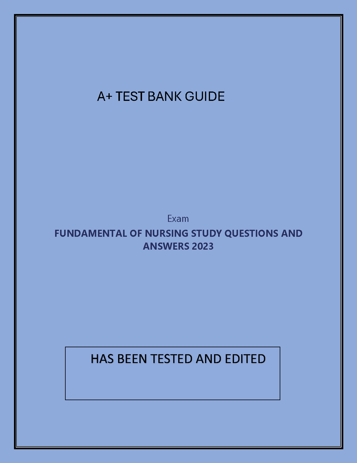 NU 136 Fundamentals of Nursing 9th Edition Potter Test Bank- Prime yourself for your Tests Study Questions and Answers Fundamentals of Nursing Study Questions and Answers 2023 Test Bank Guide NU 136 NU 136 Fundamentals of Nursing 9th Edition Potter Test Bank- Prime yourself for your Tests Study Questions and Answers NUR 160 Fundamentals of Nursing Study Questions, Study Guide Material Questions and Answers with Explanations (latest Update), 100% Correct, Download to Score A ATI Fundamentals of Nursing Exam #2 Study Guide, Questions and Answers with Explanations, 100% Correct, Download to Score A Fundamentals of Nursing Exam 2 Study Guide Questions and Answers Download to Score A ATI Funds Assessment Proctor - NR 324 ADULT HEALTH (Chamberlain College of Nursing) ATI RN Fundamentals Proctored Focus, Latest Questions and Answers with Explanations, All Correct Study Guide ATI Fundamentals of Nursing 10th Edition Potter Perry Test Bank, Latest Questions and Answers with Explanations, All Correct Study Guide, Download to Score A ATI Latest Complete GUIDE Professional Nursing Practice (NUR 3414) Summary Fundamentals of Nursing lectures - Exam 1-3 Study Guide Graded A, Latest Questions and Answers with Explanations, All Correct Study Guide, Download to Score A ATI Foundations of Nursing Complete Study Guide - ATI Fundamentals of Nursing - Questions and Last Page Answers All Correct Graded A, Latest Questions and Answers with Explanations, All Correct Study Guide, Download to Score A