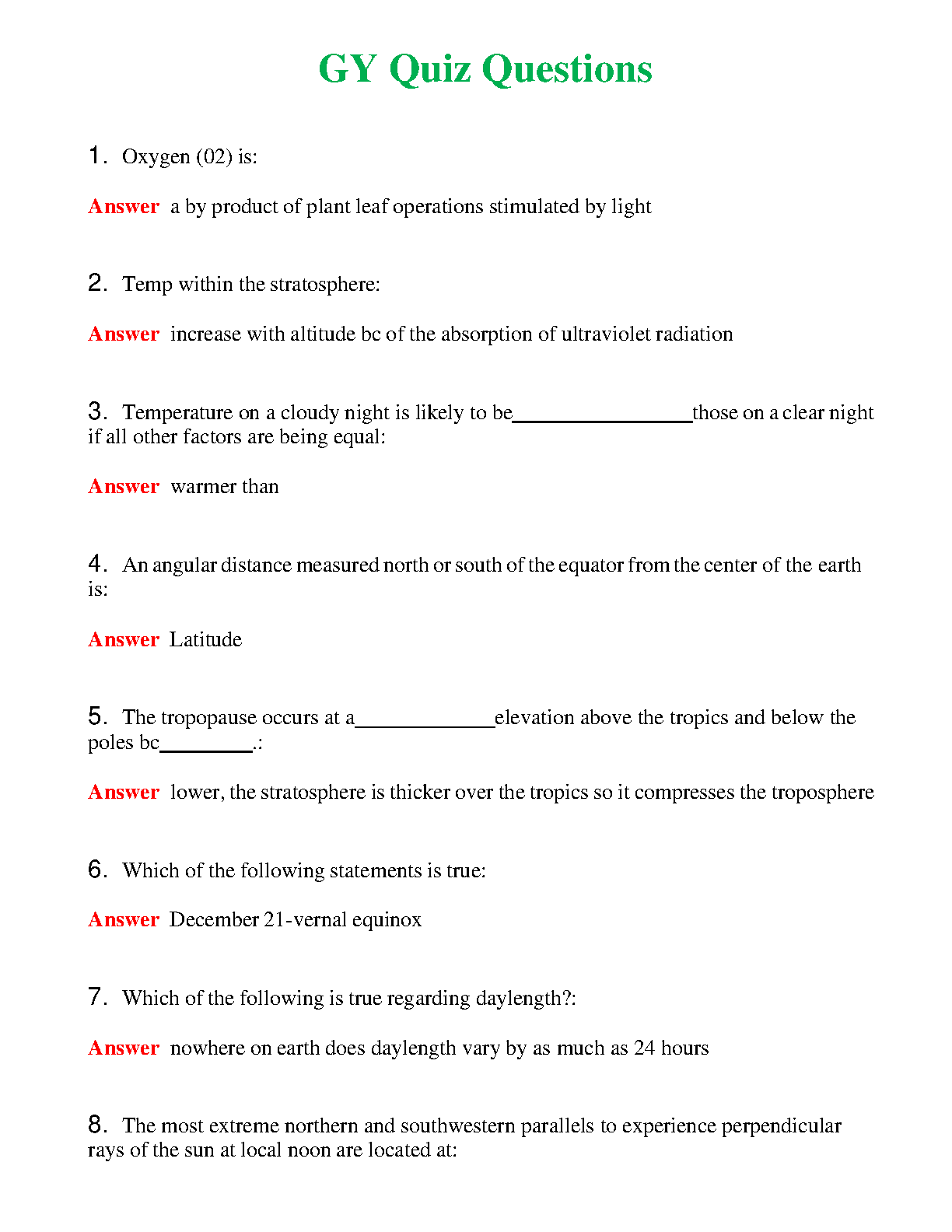 These Earth Science quiz questions and answers are designed to help students prepare for their exams in 2024/2025. The quiz covers a range of topics, including the stratosphere, temperature on a cloudy night, the tropopause, and daylength. The answers are provided, so students can check their understanding and identify any areas they need to study further. This resource will help students pass their exams with confidence and avoid resits.