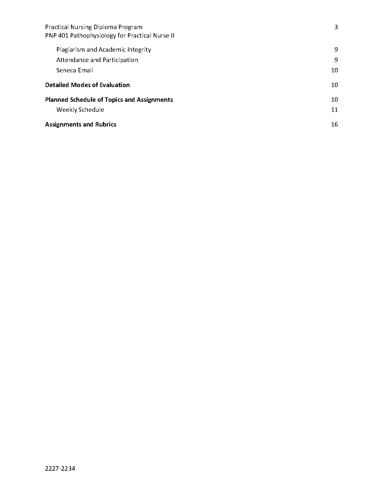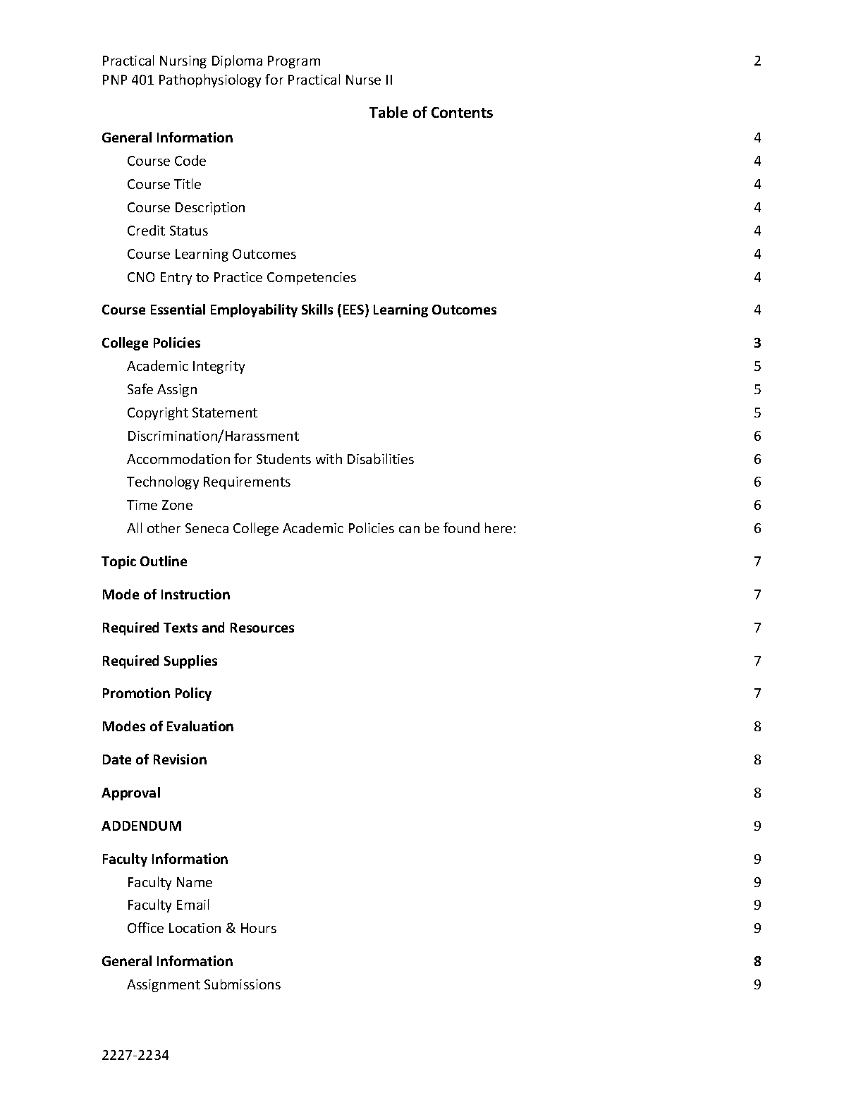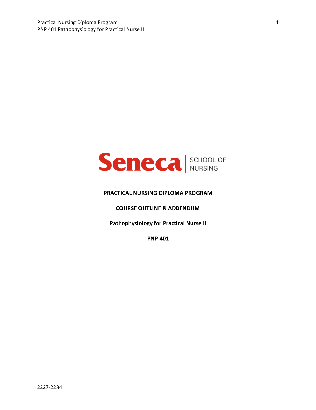 Seneca College Pathophysiology for Practical Nurse II Course Outline and Addendum