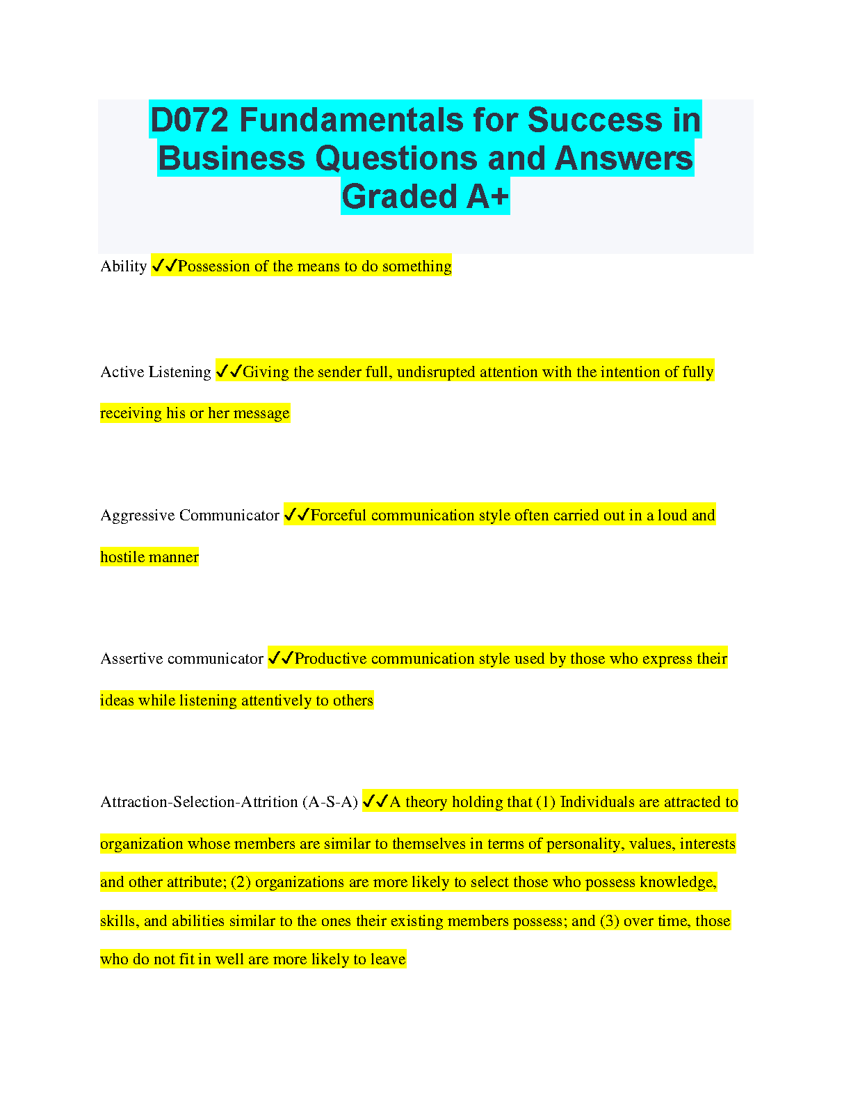 D072 Fundamentals for Success in Business Questions and Answers Graded A+