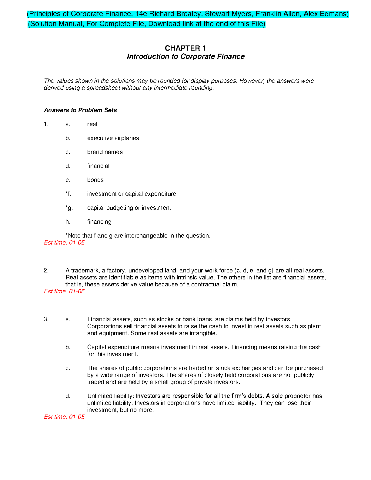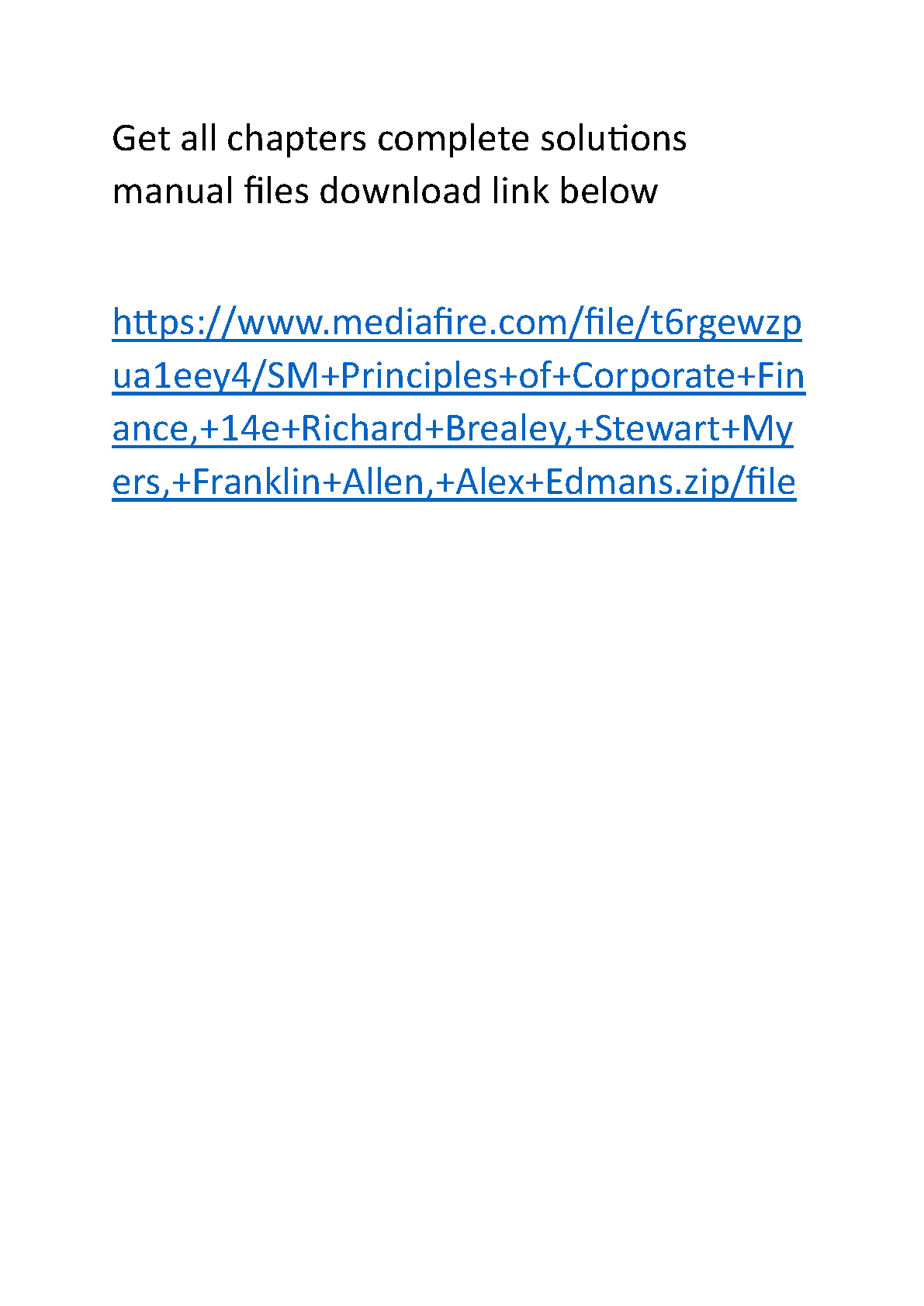 Principles of Corporate Finance, 14e - Richard Brealey, Stewart Myers, Franklin Allen, Alex Edmans - Solution Manual for 2024/2025