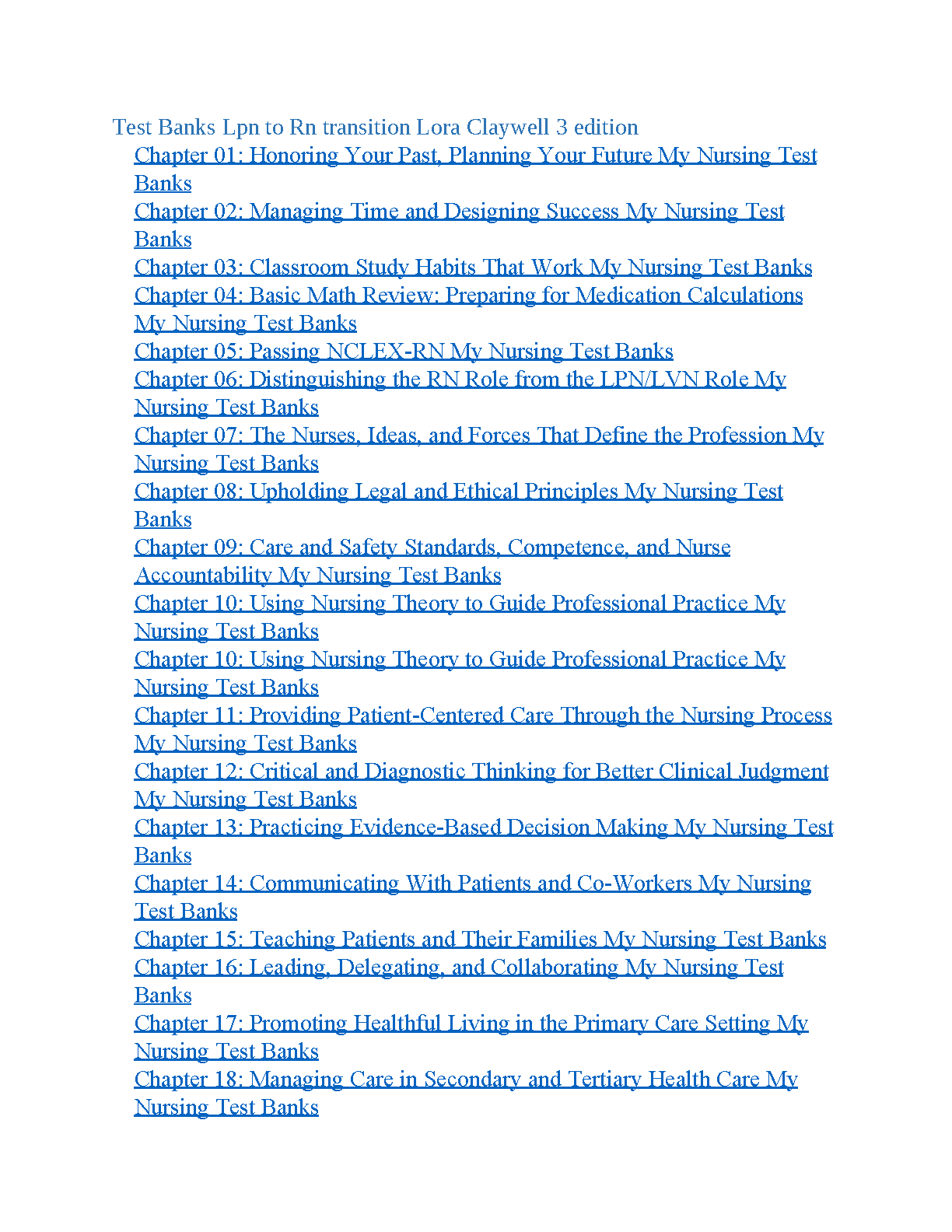 Ace your LPN to RN transition exams with this comprehensive test bank for Lora Claywell's 3rd edition of "LPN to RN Transitions". This resource provides practice questions and answers aligned with the latest nursing curriculum.