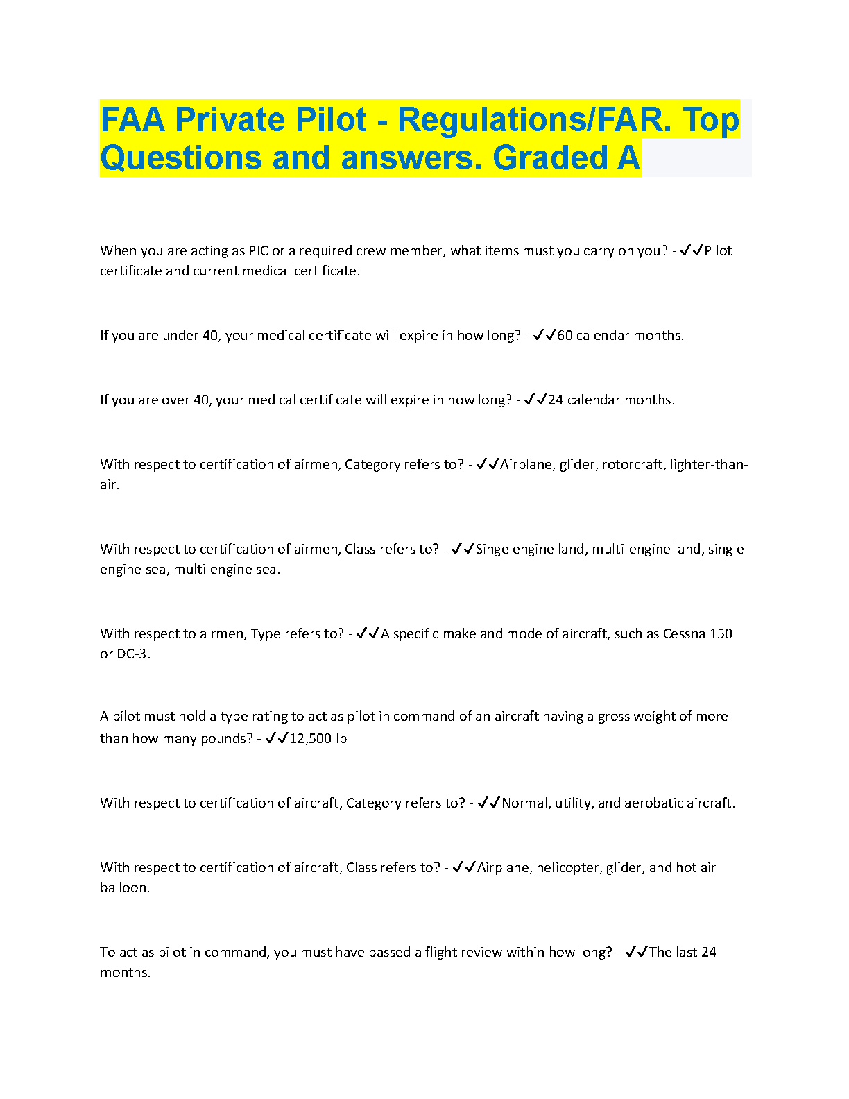 Ace your FAA Private Pilot exam on the first try with this comprehensive guide! Graded A questions and answers covering regulations, FARs, and essential concepts, providing insights to boost your exam score.