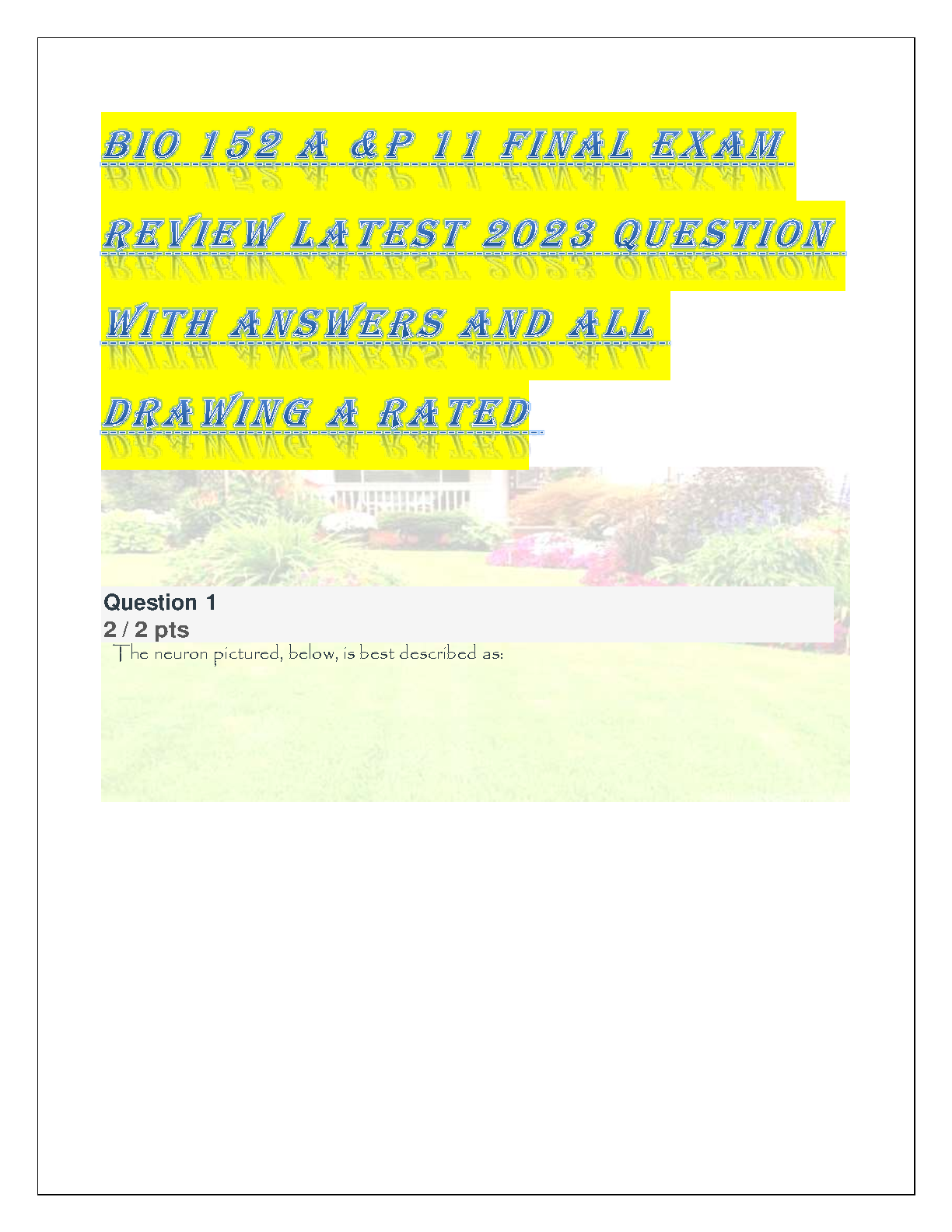 Ace your BIO 152 A & P 11 Final Exam with this comprehensive review guide featuring the latest 2023 questions and answers. Includes all drawing A rated for a complete study experience.