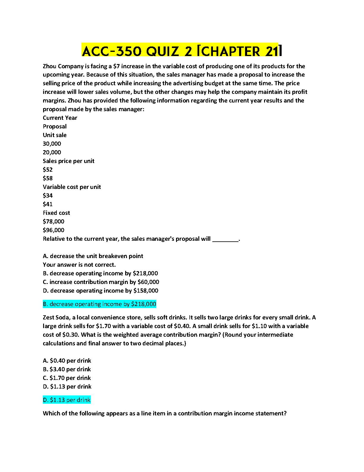 This ACC-350 Quiz 2 resource covers chapter 21 of Accounting Principles and is designed to help you achieve a great score on your first attempt, avoiding resits.