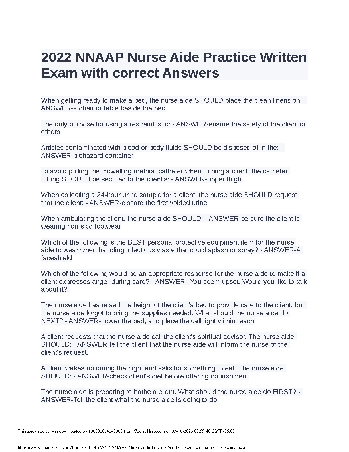 This comprehensive resource includes practice questions and answers covering essential topics for the 2022 NNAAP Nurse Aide Exam. Prepare for your exam with confidence by reviewing this guide and ensure you understand critical concepts in CNA practice.