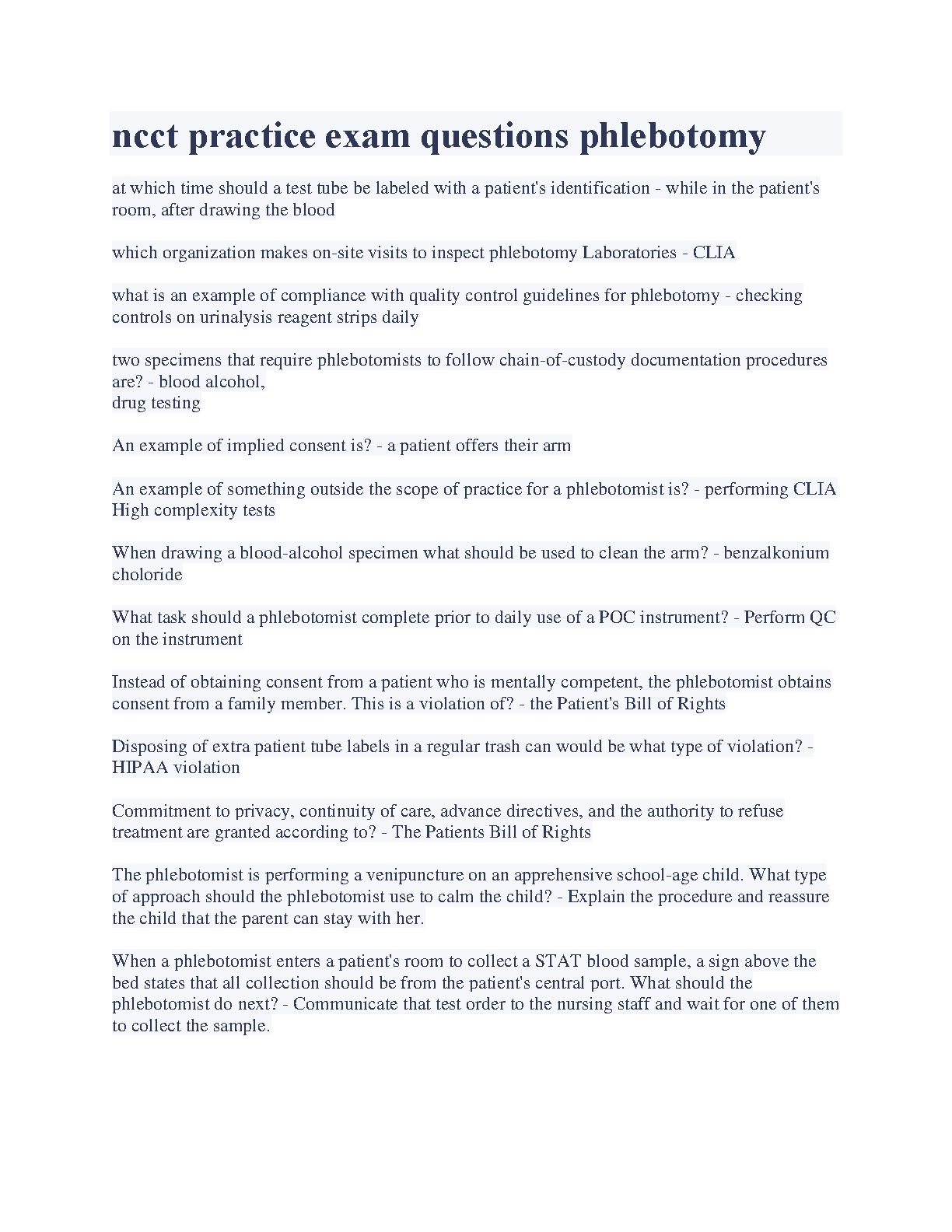 This comprehensive Ncct practice exam questions for phlebotomy will guide you through the critical concepts and procedures needed for a successful career in the field. Our materials cover essential topics such as patient identification, quality control, chain-of-custody documentation, informed consent, venipuncture techniques, and more. Enhance your understanding and boost your confidence with our detailed explanations and practice questions. Pass your exam with ease and embark on your journey as a proficient phlebotomist.