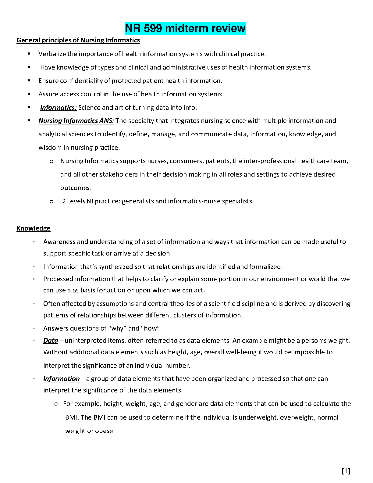 This comprehensive NR 599 midterm review is designed to help you excel on your first attempt. Get access to vital concepts, definitions, and practice questions related to General Principles of Nursing Informatics. This study guide covers all the key areas, ensuring you're well-prepared for success. Avoid resits and conquer your exams with confidence!