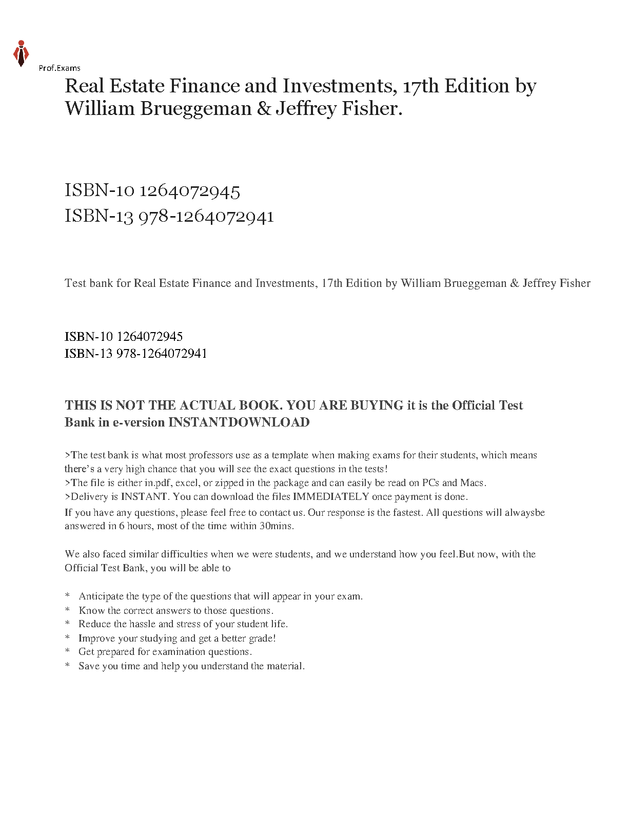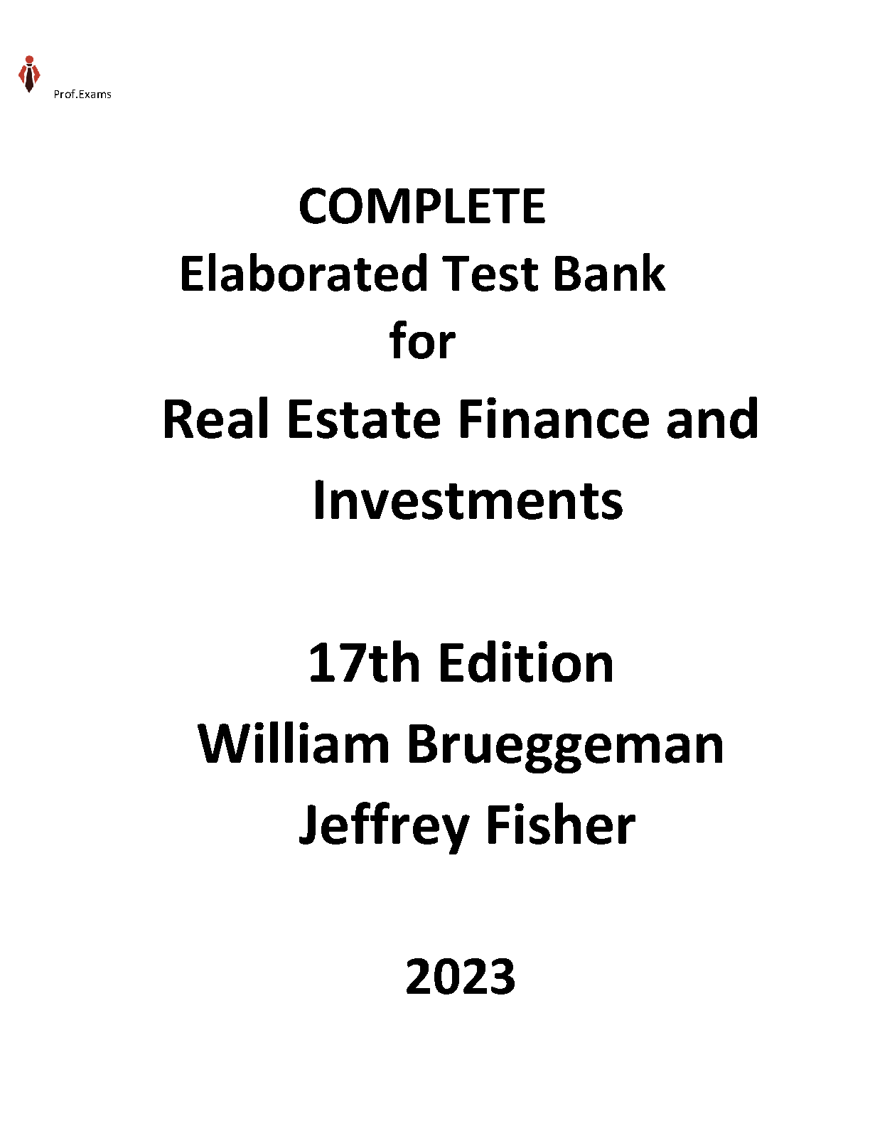 This Test Bank for Real Estate Finance and Investments, 17th Edition by William Brueggeman and Jeffrey D. Fisher is designed to help students succeed in their real estate courses. This resource includes a comprehensive collection of multiple choice, true/false, and essay questions that cover all the key concepts and topics covered in the textbook. The test bank is an invaluable tool for instructors who want to create challenging and engaging assessments for their students.