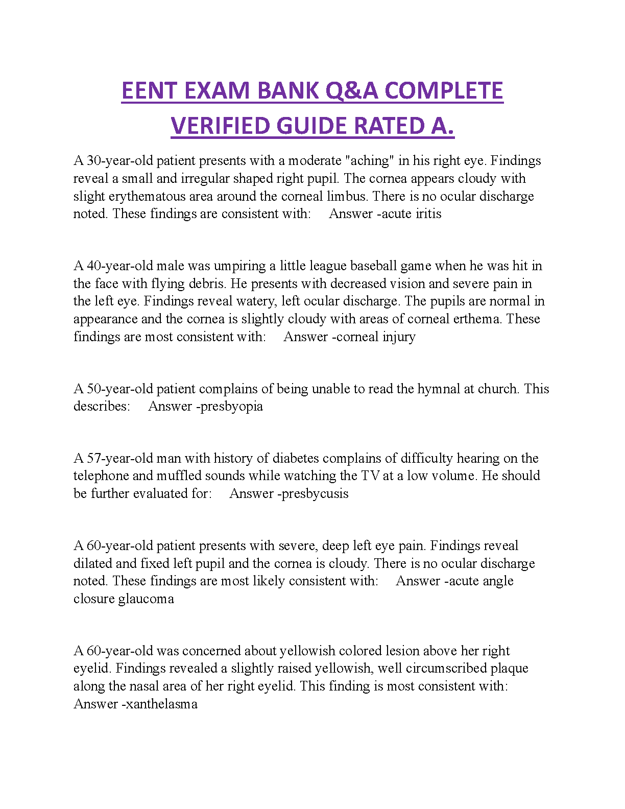 EENT EXAM BANK Q&A COMPLETE VERIFIED GUIDE RATED A.