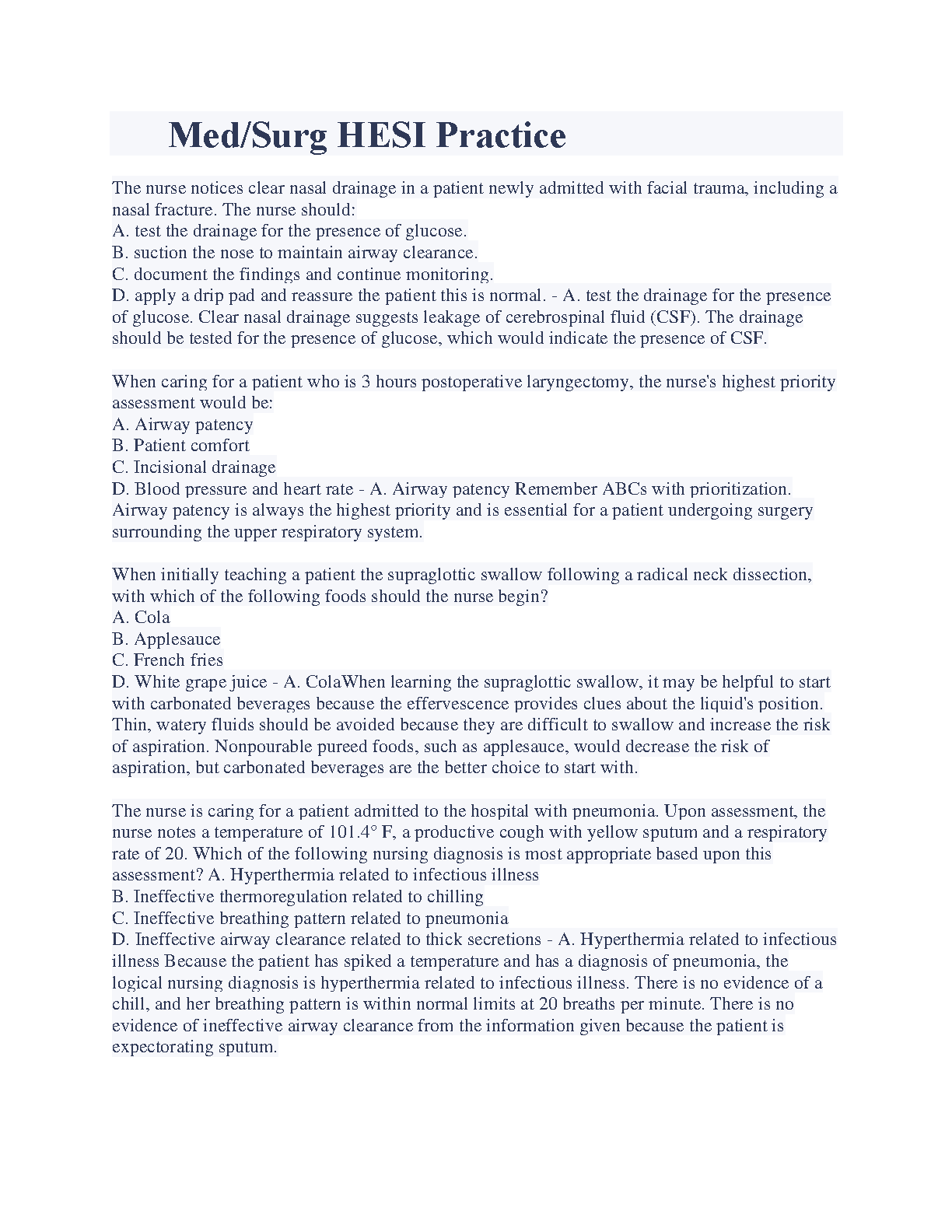 Master the essential concepts of medical-surgical nursing with this comprehensive Med/Surg HESI practice resource, designed to help you ace your exam and avoid resits. This guide covers a wide range of topics, including airway management, postoperative care, infection control, and much more, with practice questions and detailed explanations.
