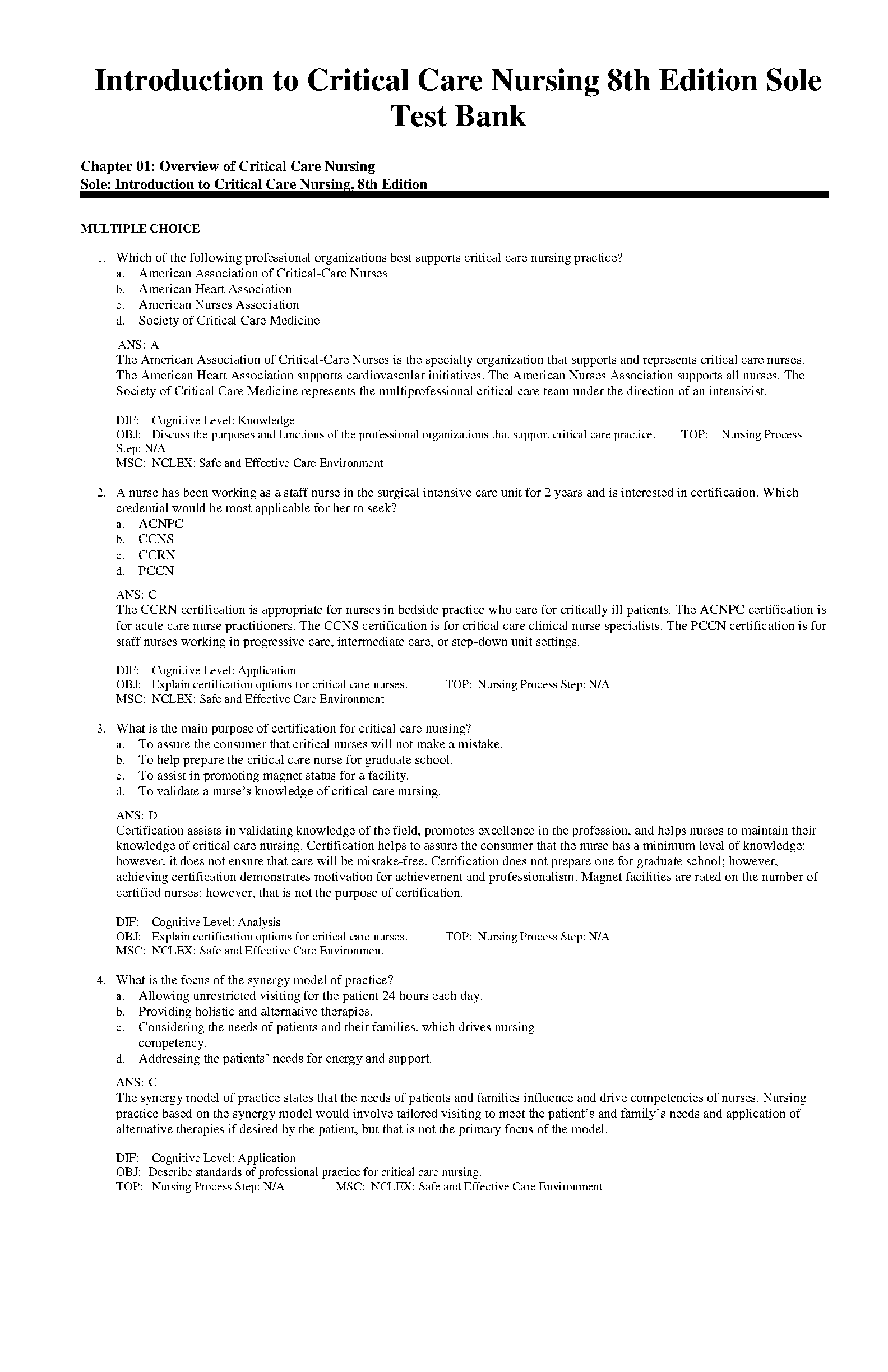 Get ready to ace your critical care nursing exams with this comprehensive test bank for Introduction to Critical Care Nursing 8th Edition by Sole, Patricia and Sole, Linda. This invaluable resource will help you solidify your understanding of critical care concepts and practice answering exam-style questions. You'll gain confidence in your knowledge and boost your chances of passing on the first try.