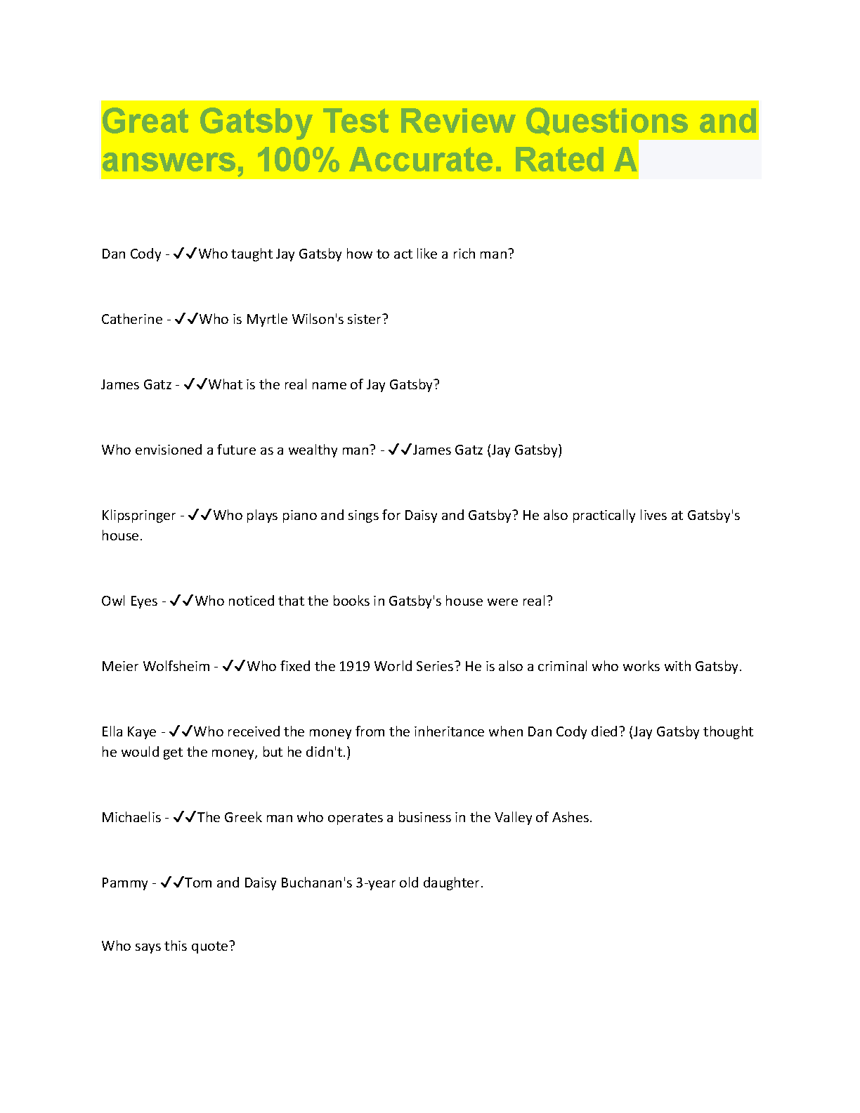 The Great Gatsby Test Review Questions and Answers, 100% Accurate: Rated A - F. Scott Fitzgerald
