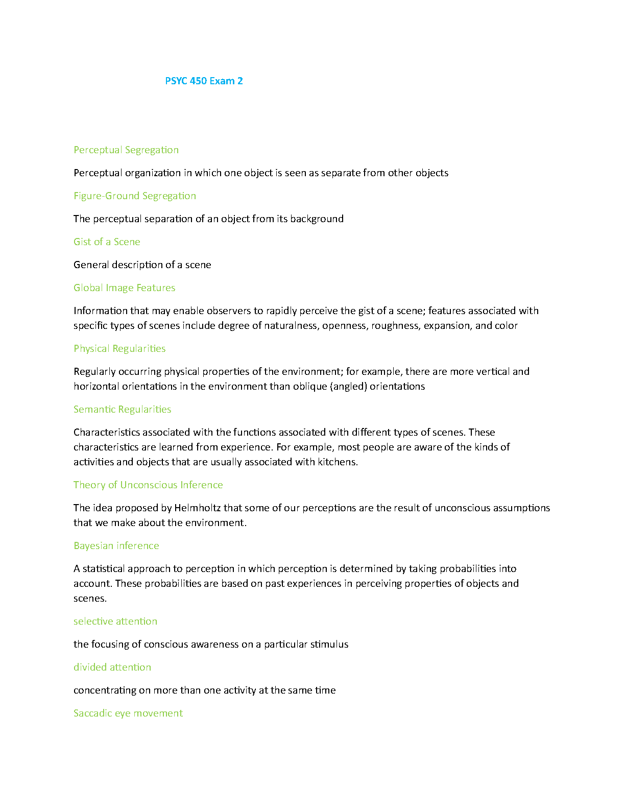 Master the concepts of perceptual segregation, global image features, physical regularities, semantic regularities, theory of unconscious inference, and Bayesian inference. This comprehensive guide covers key topics for PSYC 450 Exam 2, ensuring you're well-prepared for success on your first attempt.