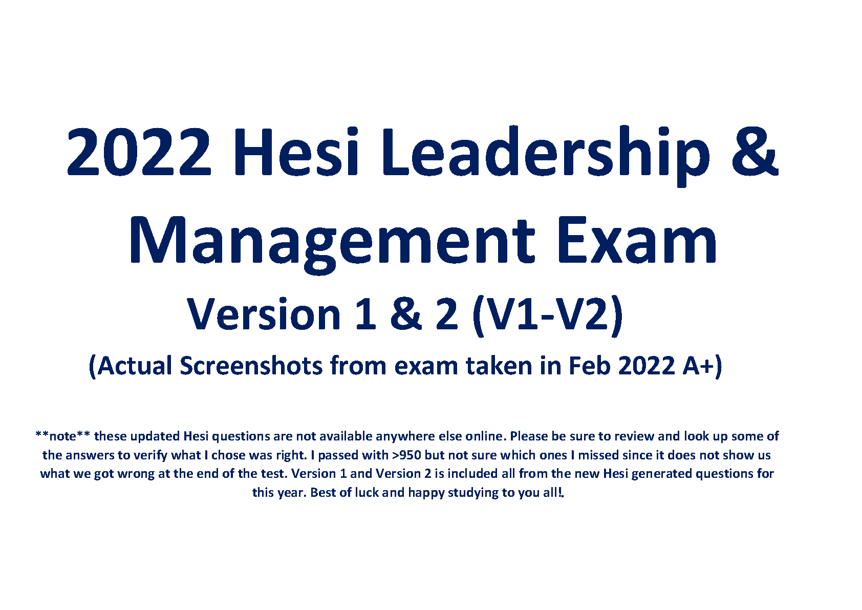 Actual screenshots from the 2022 HESI Leadership & Management Exam, covering versions 1 & 2. This resource is perfect for anyone preparing for the HESI exam and wanting to avoid resits. Get access to the actual questions and answers and maximize your chances of success on your first attempt.