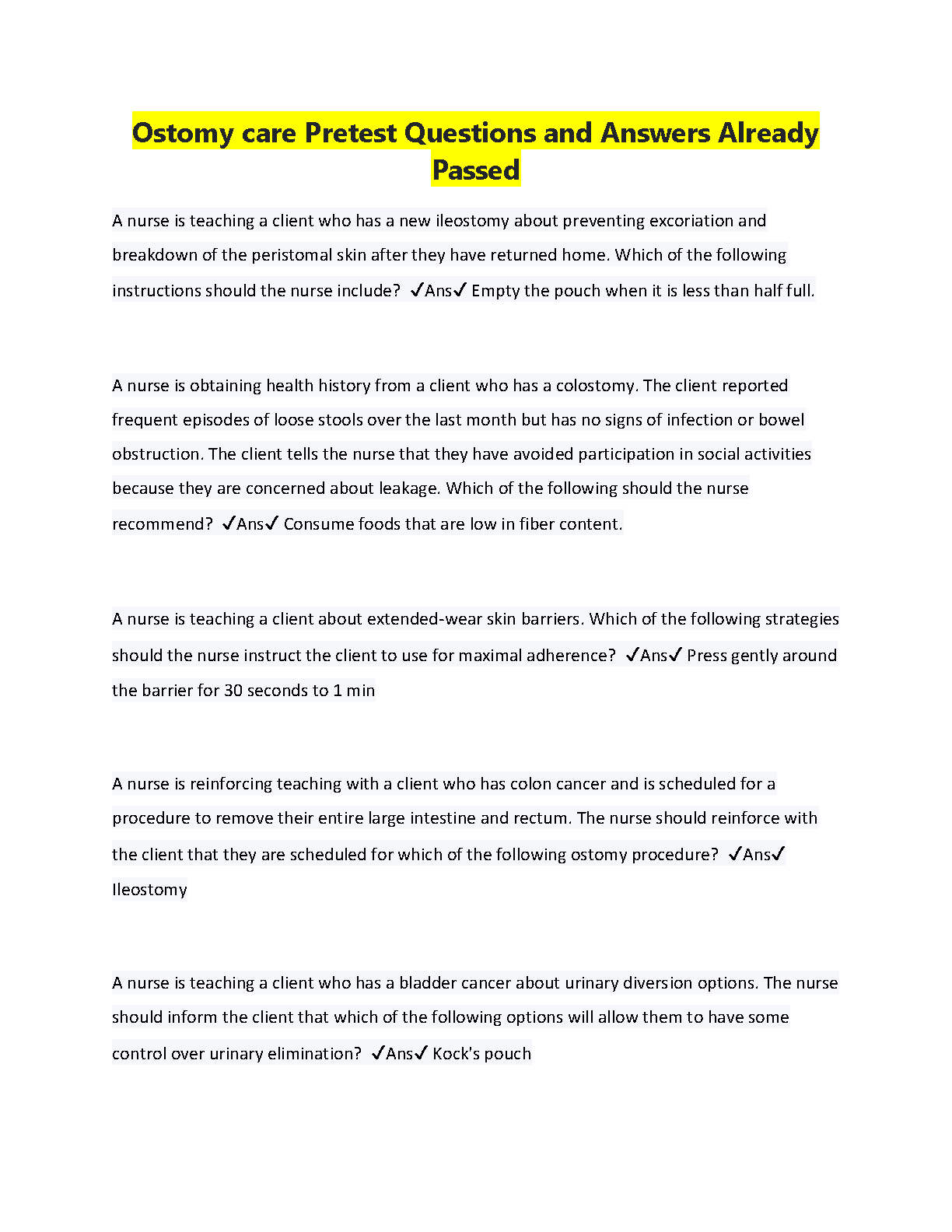 This study guide includes ostomy care pretest questions with answers that have already been answered and passed. Get ready to pass your exams on the first attempt and avoid resits.