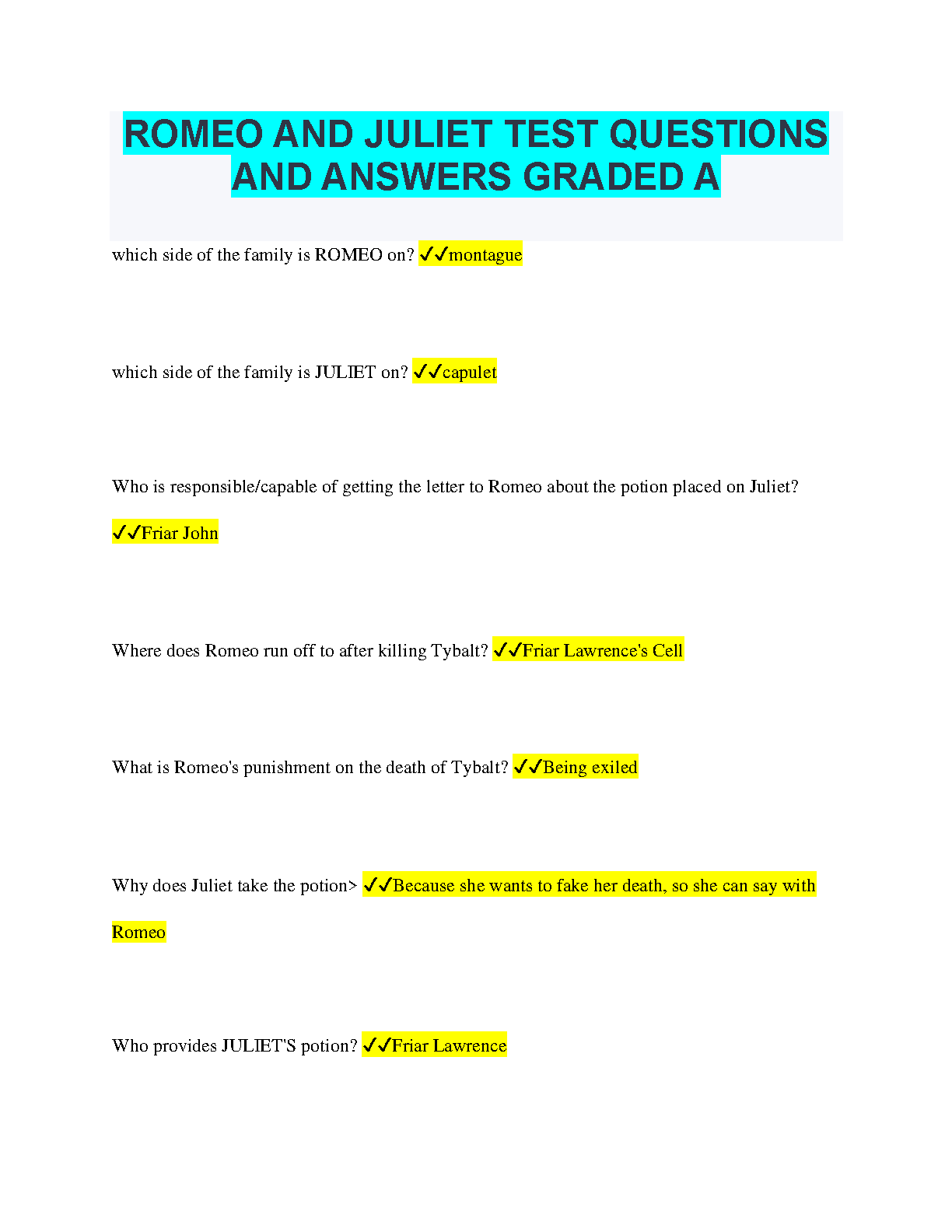 This is a graded A test bank for Romeo and Juliet for the 2024/2025 academic year. It contains detailed and well-structured test questions and answers that cover the core concepts and themes of Shakespeare's tragic play. This resource is a must-have for students looking to improve their understanding of the play and succeed in their exams.