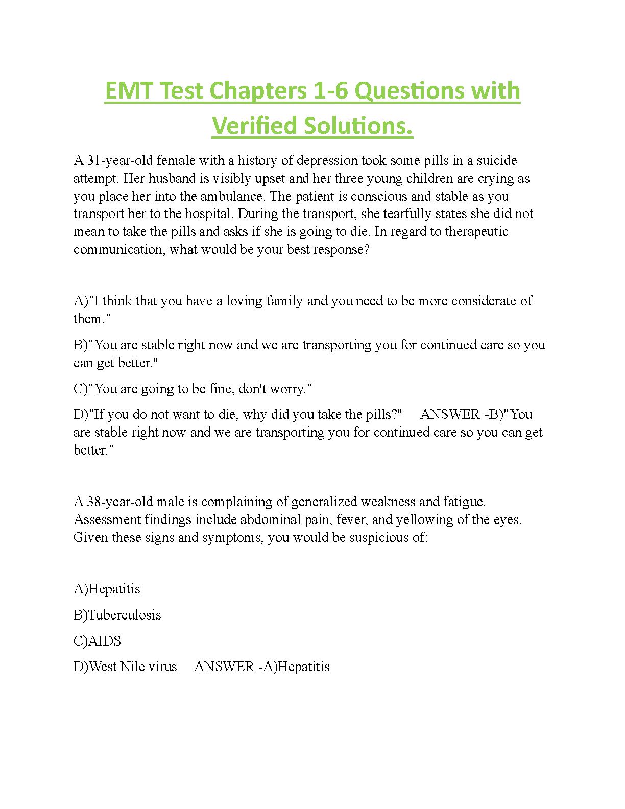 EMT Test Chapters 1-6 Questions with Verified Solutions for 2024/2025 Success