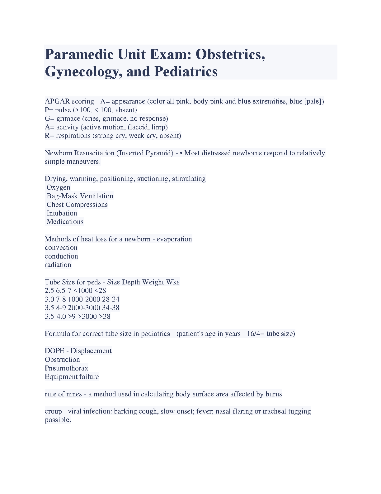 Paramedic Unit Exam: Obstetrics, Gynecology, and Pediatrics Study Guide for 2024/2025 Exams