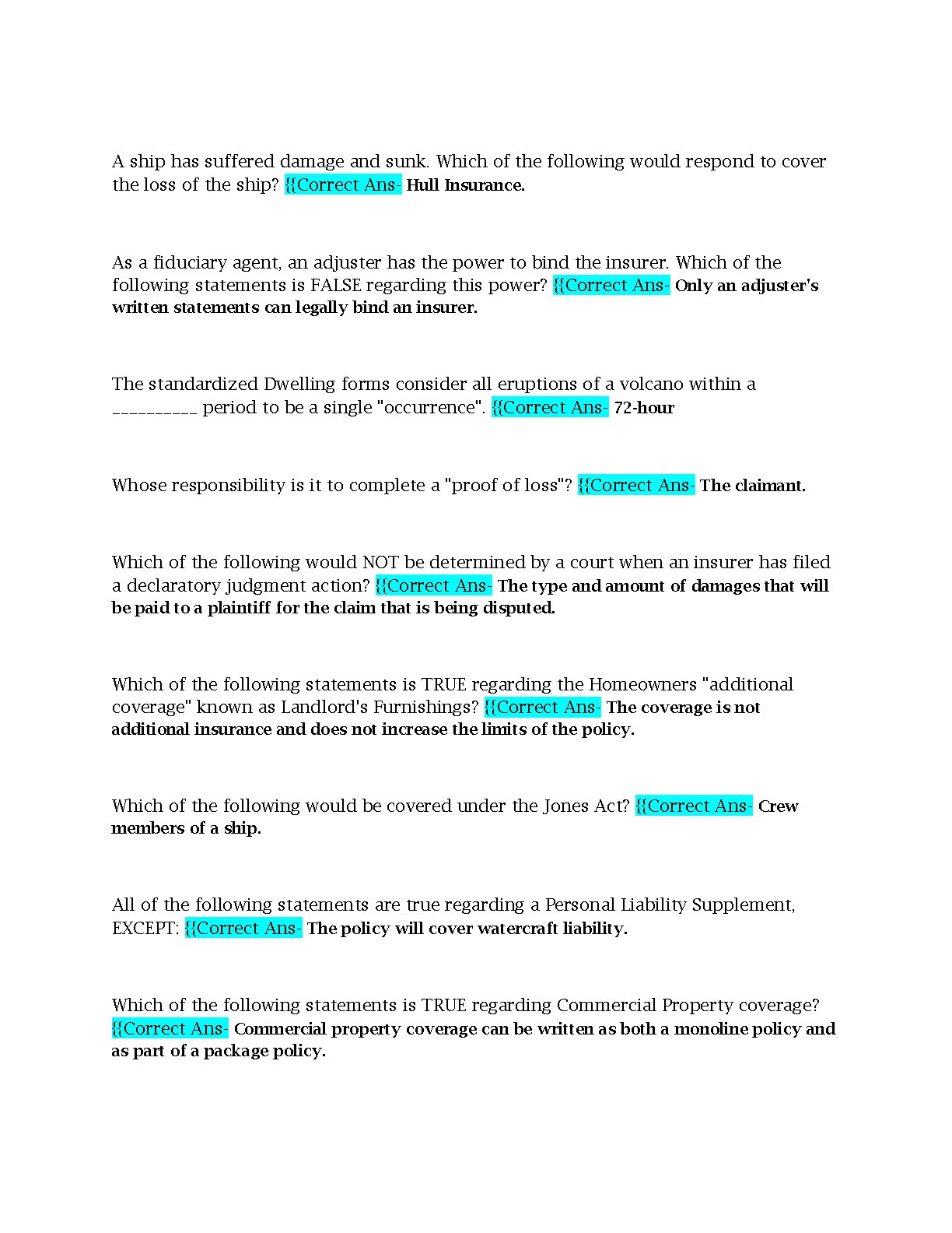 Texas All Lines Adjuster Exam Questions and Answers [Assured A+ Grade] 2024/2025 - Pass on the First Attempt