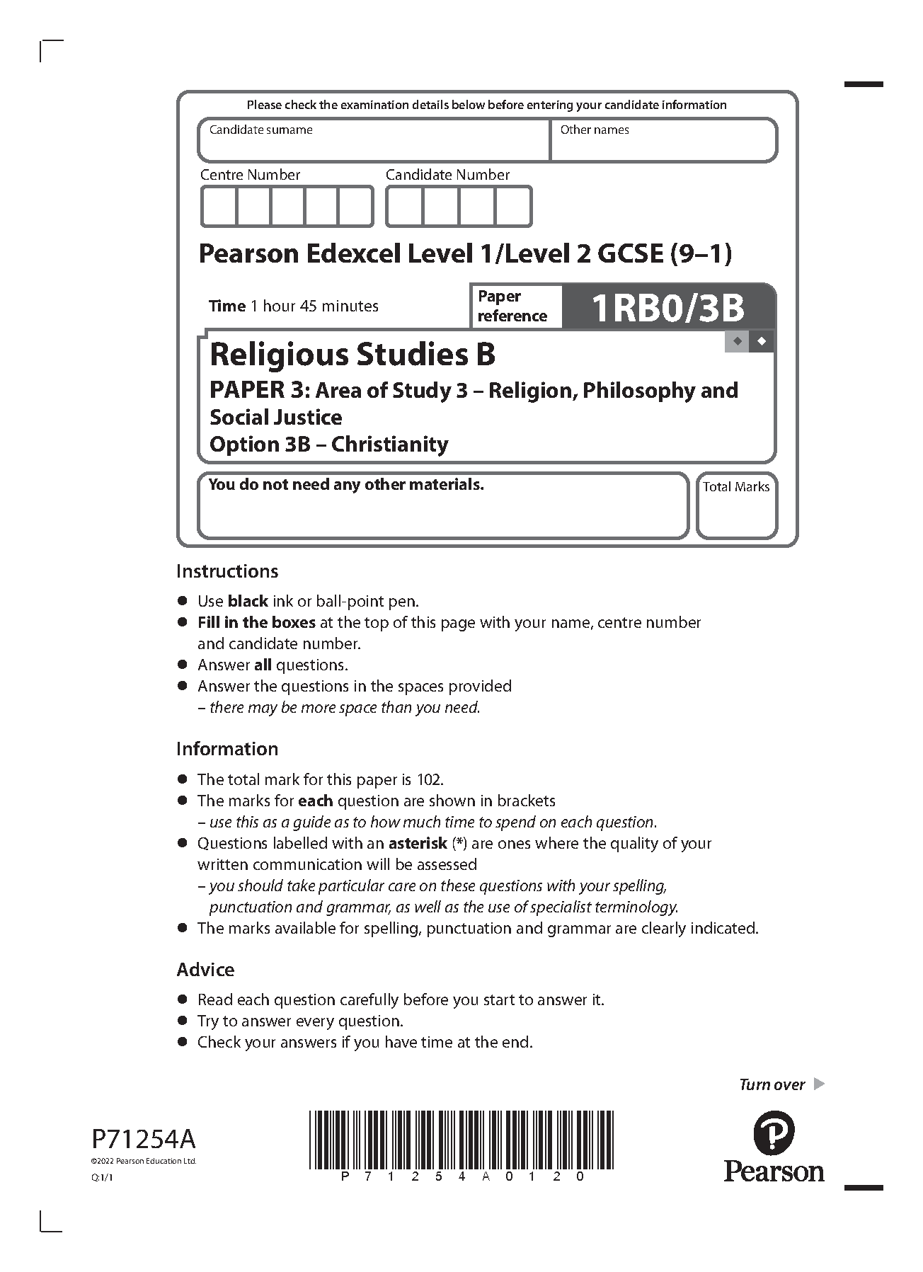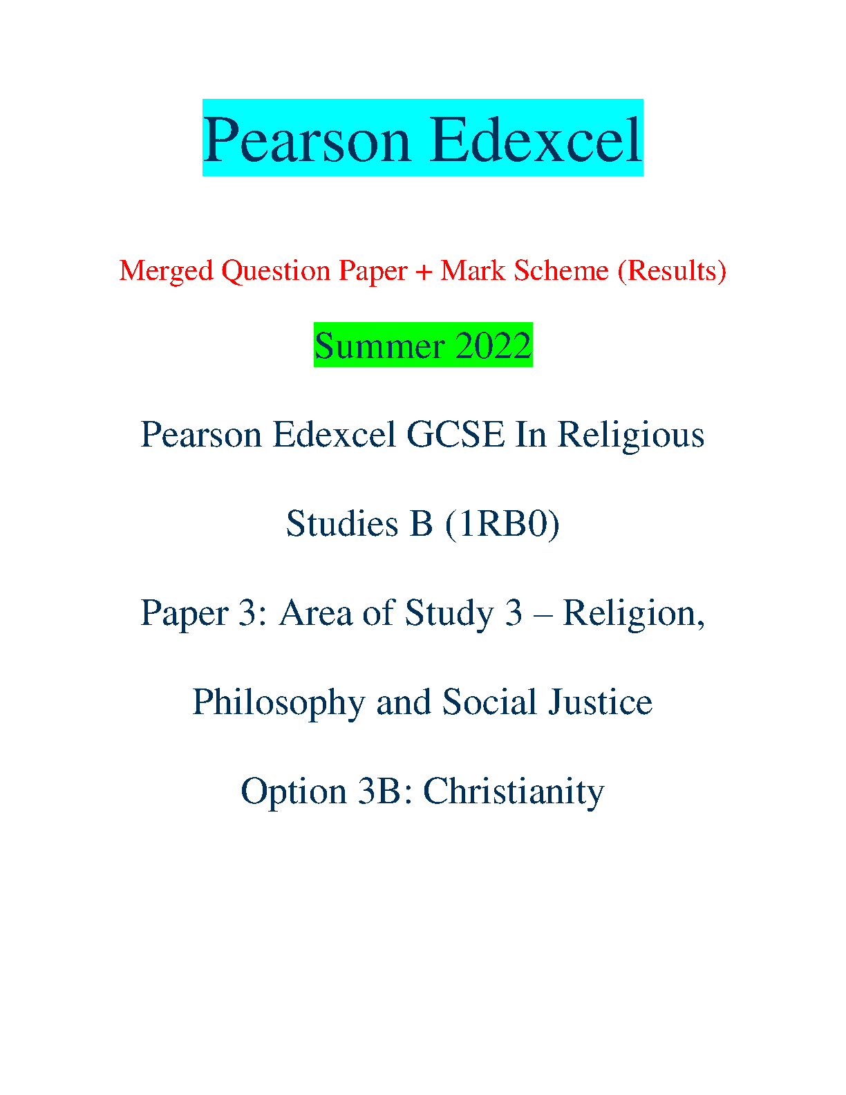 Pearson Edexcel GCSE in Religious Studies B (1RB0) 2022 Summer - Paper 3: Area of Study 3 - Religion, Philosophy and Social Justice Option 3B: Christianity - Merged Question Paper + Mark Scheme (Results)