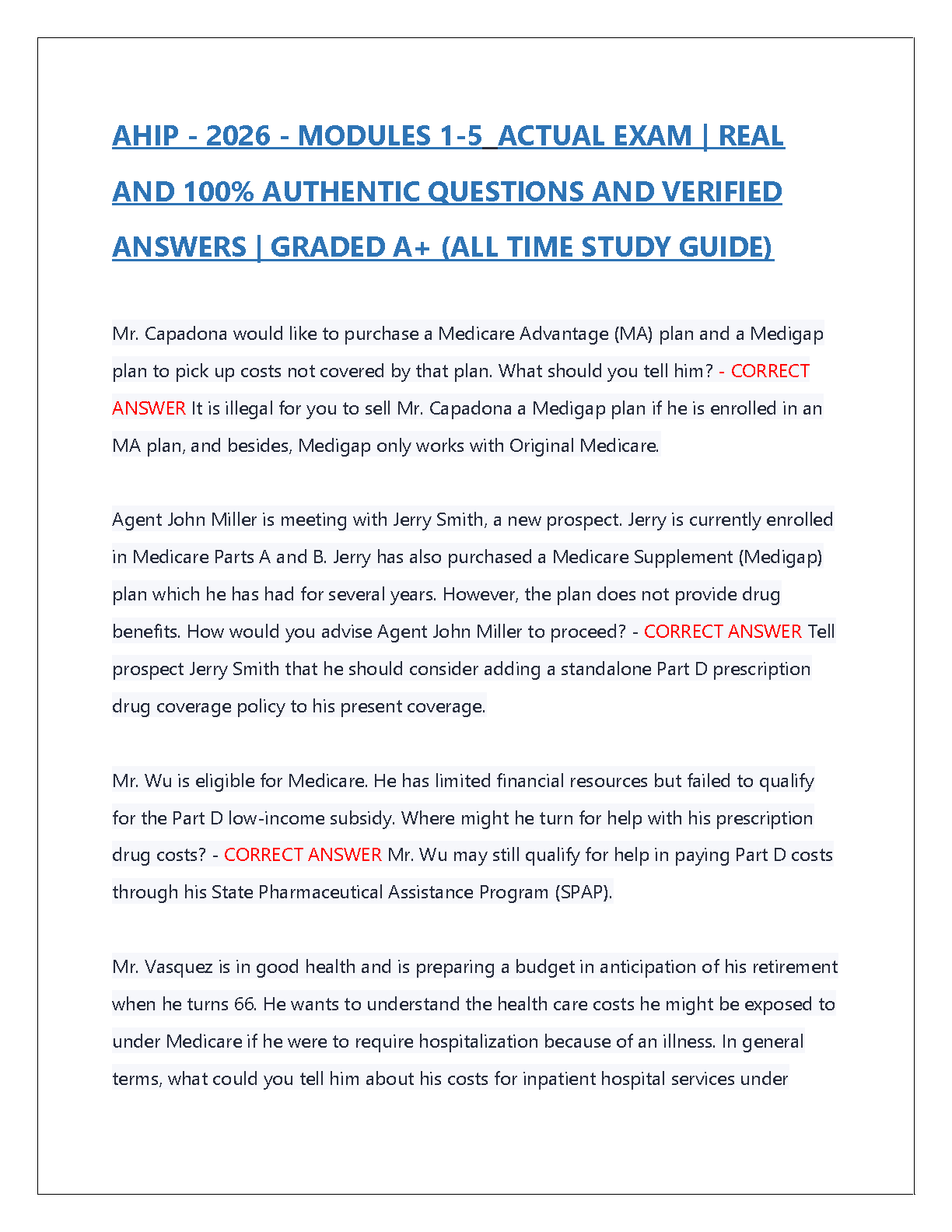 AHIP 2023 Final Verified Questions & Answers A+ includes the most accurate AHIP exam questions and answers. These practice questions are designed to help students pass the AHIP exam on their first attempt and avoid resits. This comprehensive resource covers all the essential topics for the AHIP exam and will equip you with the knowledge you need to succeed.