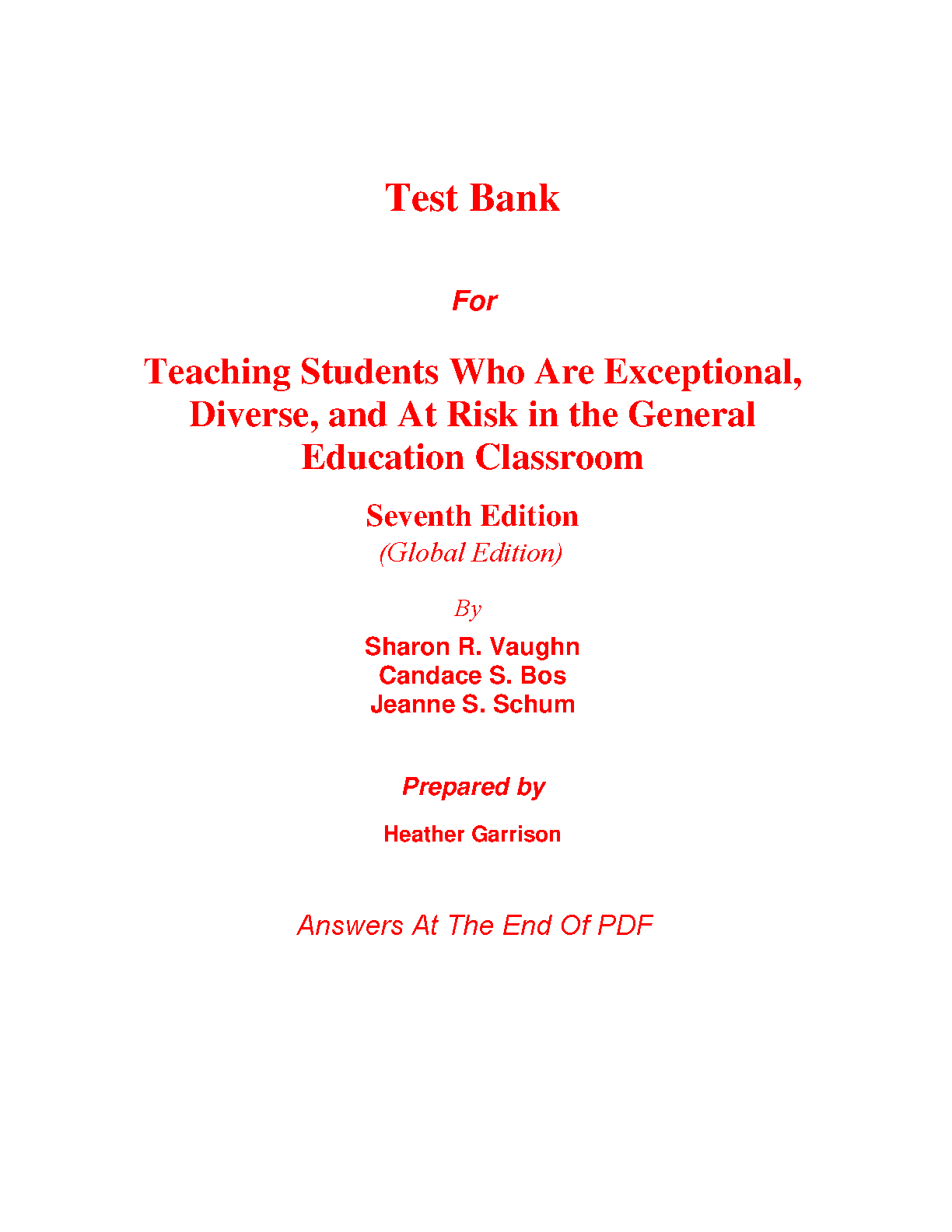 Ace your exams with this comprehensive Test Bank for "Teaching Students Who Are Exceptional, Diverse, and At Risk in the General Education Classroom" 7th Edition by Sharon R. Vaughn, Candace S. Bos, Jeanne S. Schum.