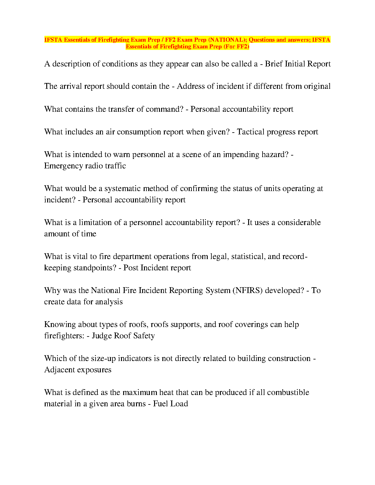 IFSTA Essentials of Firefighting Exam Prep / FF2 Exam Prep (NATIONAL); Questions and answers; IFSTA Essentials of Firefighting Exam Prep (For FF2)