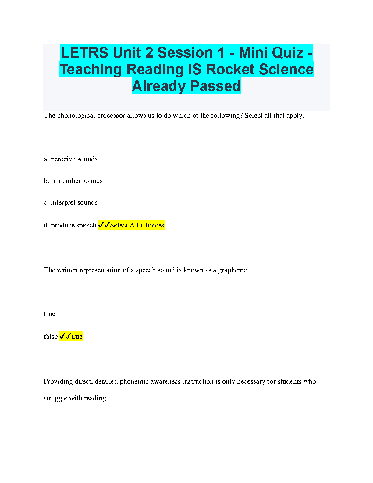 LETRS Unit 2 Session 1 - Mini Quiz - Teaching Reading IS Rocket Science Already Passed