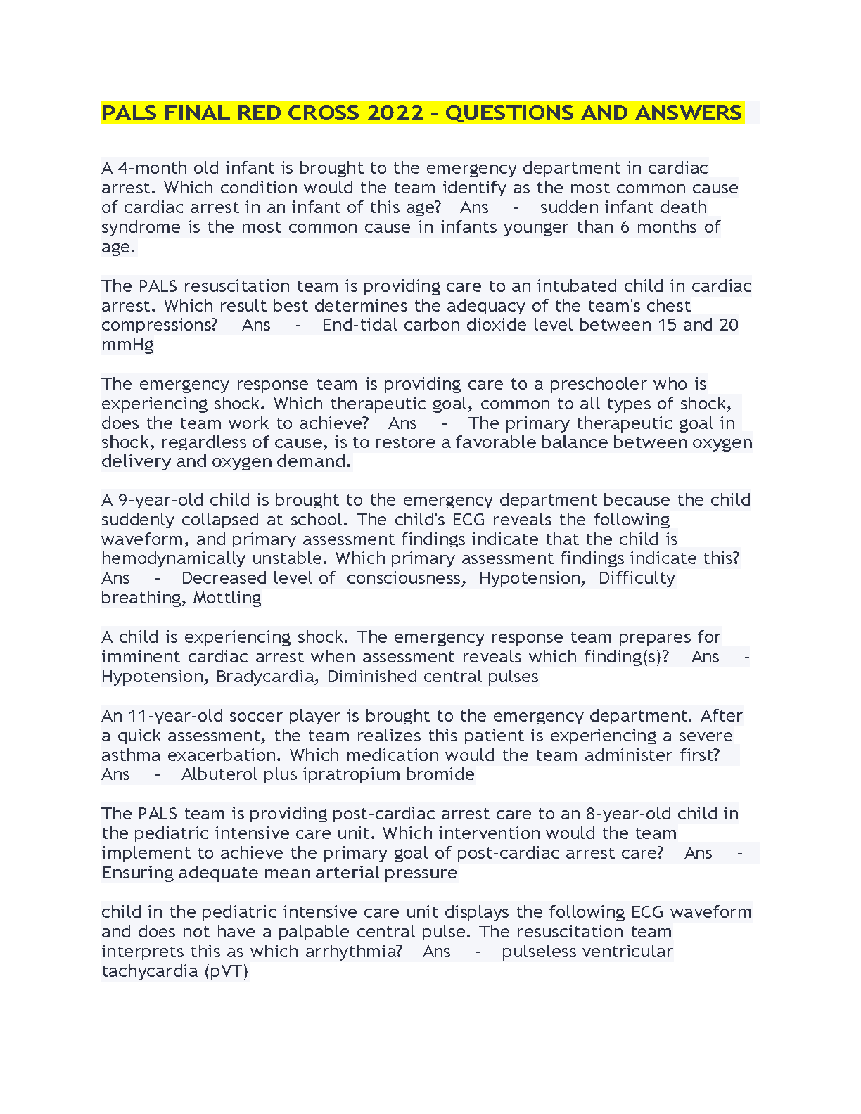 PALS Final Red Cross 2022 - Questions and Answers by American Heart Association is a comprehensive resource that provides a detailed overview of the PALS curriculum, covering a wide range of topics including cardiac arrest, shock, and post-cardiac arrest care. This resource includes a variety of questions and answers, as well as explanations and rationale, making it an ideal tool for students preparing for the PALS certification exam.