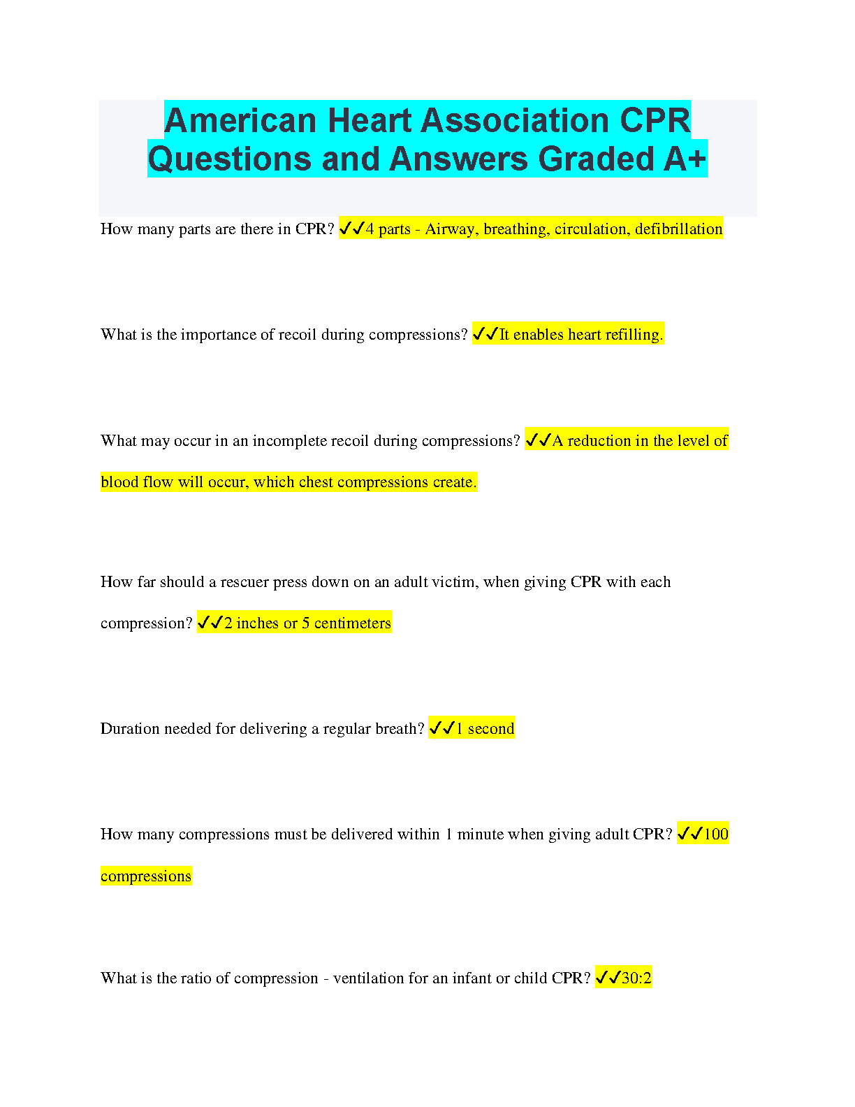 American Heart Association CPR Questions and Answers Graded A+