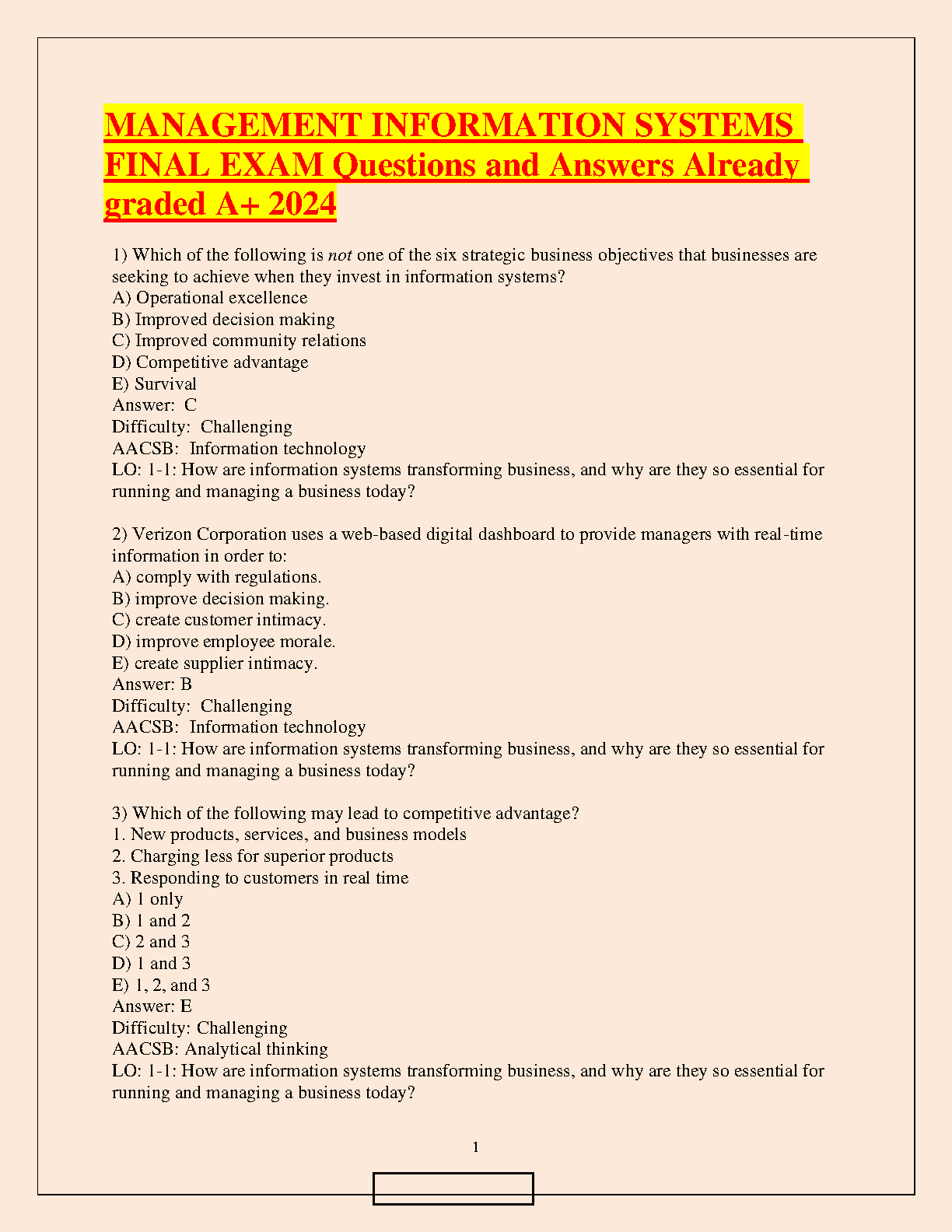 Get the best grade possible in your Management Information Systems class with these final exam questions and answers! This resource is designed to help students understand the key concepts and principles of Management Information Systems and pass their exams on the first attempt.