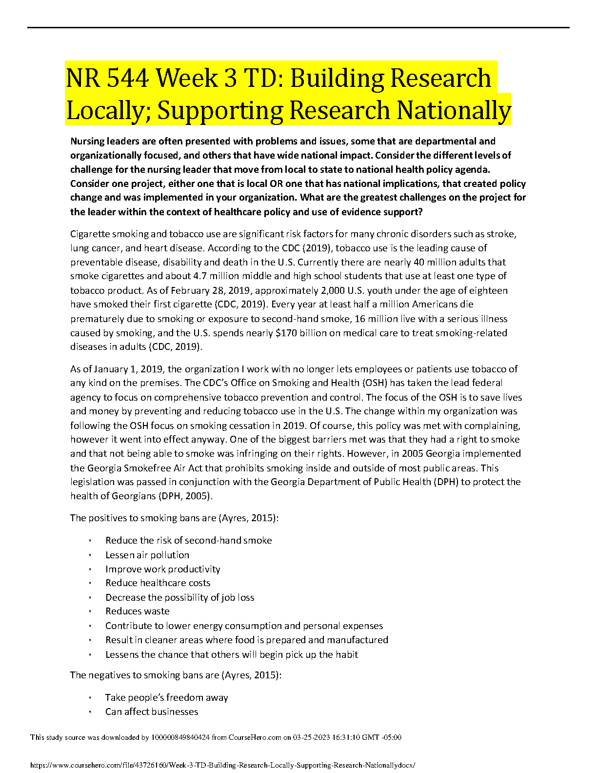 NR 544 Week 3 TD: Building Research Locally; Supporting Research Nationally for 2024/2025 - Ace Your Exams on the First Attempt