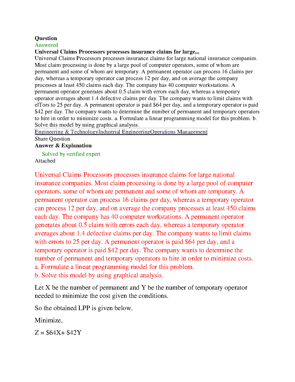 This resource is a valuable asset for students looking to excel in their Operations Management courses and gain a strong understanding of linear programming techniques. With its real-world application in insurance claim processing, it provides a practical and relevant example to solidify your knowledge. Get ready to ace your exams on the first attempt and avoid resits!