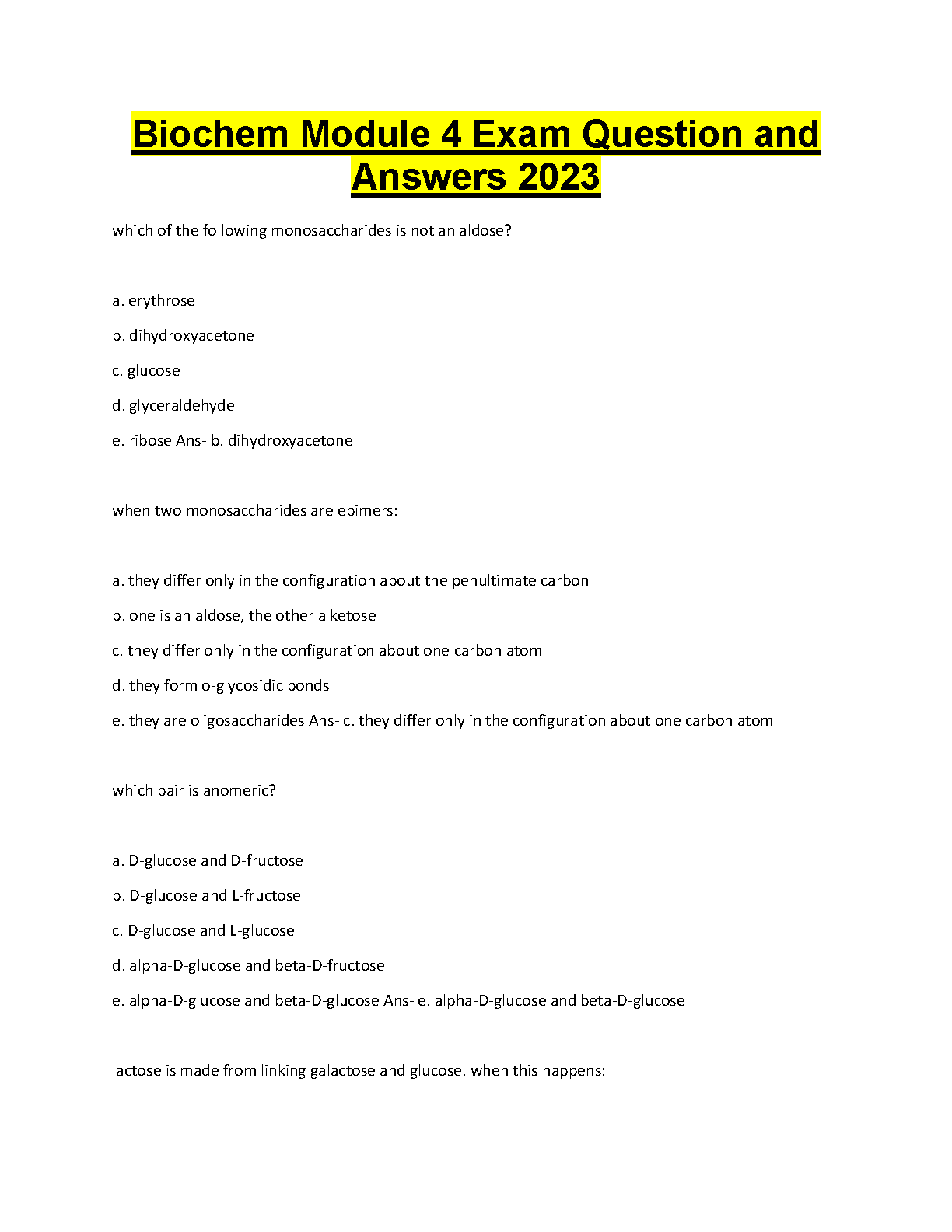 This resource is a comprehensive guide to Biochem Module 4 exam questions and answers. Designed to help students prepare effectively and confidently for their exams, this resource covers a wide range of topics, including monosaccharides, aldoses, ketoses, epimers, anomers, and glycosidic bonds.
