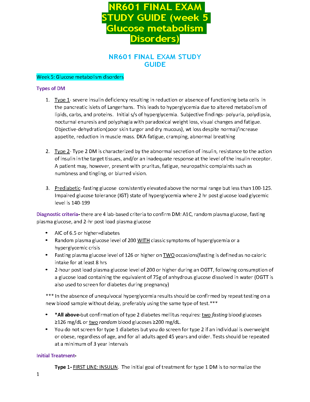 Ace your NR601 final exam on the first attempt with this comprehensive study guide covering week 5, focusing on glucose metabolism disorders. Understand the different types of diabetes, diagnostic criteria, and treatment approaches, ensuring you are fully prepared for success.