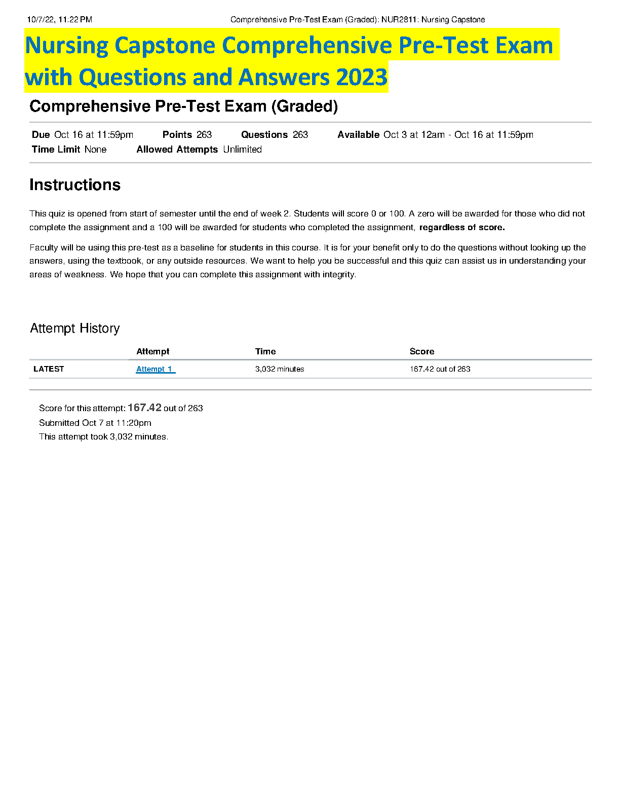 Nursing Capstone Comprehensive Pre-Test Exam (Graded) with Questions and Answers 2023