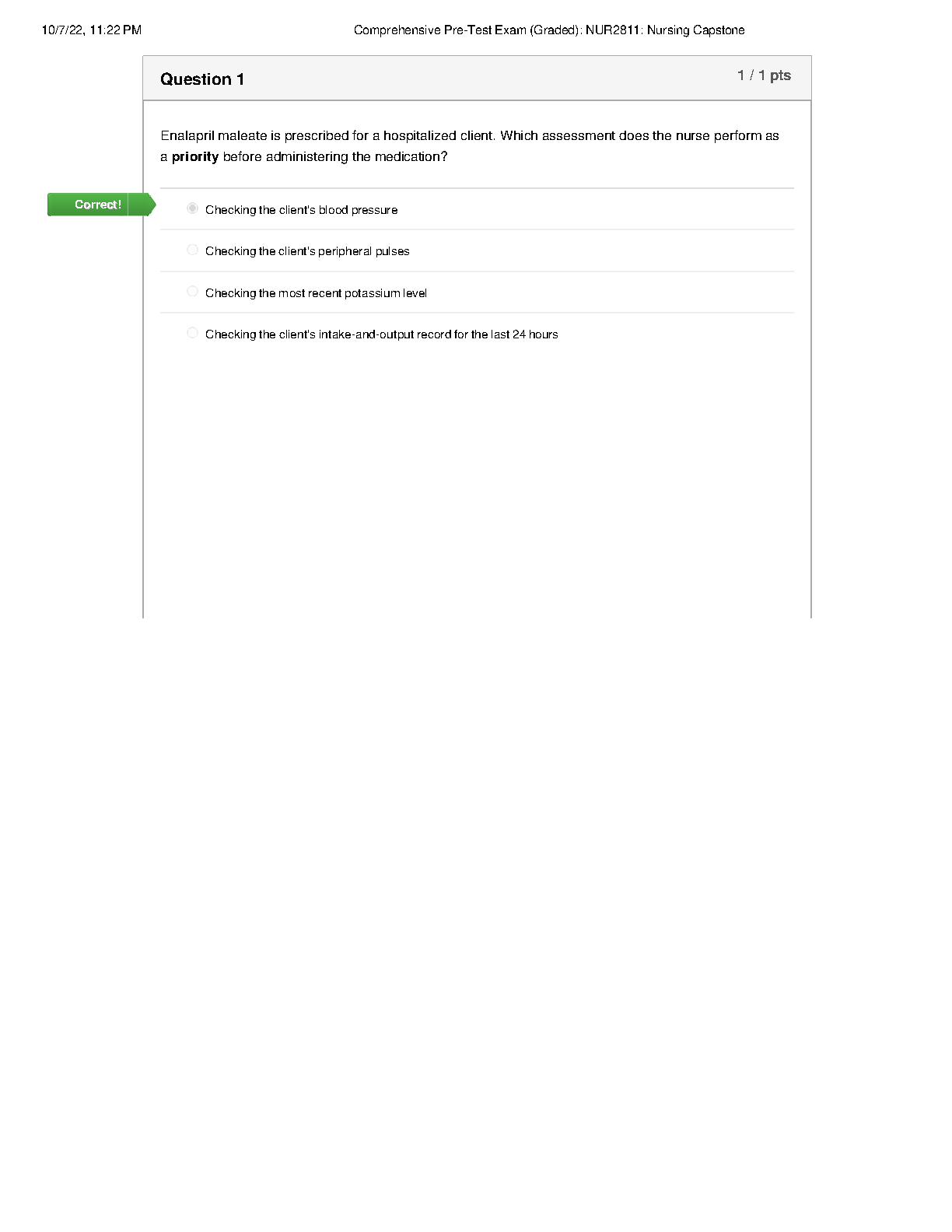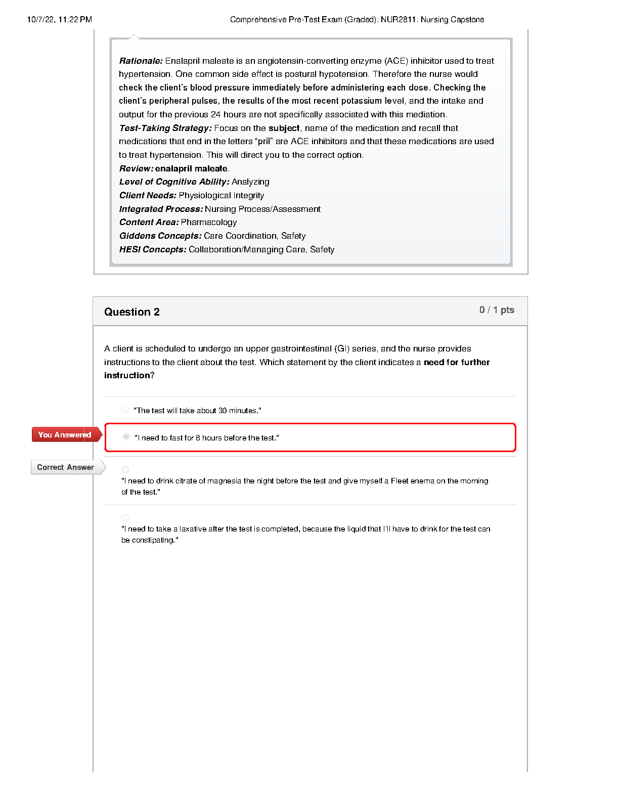 This is a comprehensive pre-test exam for Nursing Capstone students. This exam covers all of the material covered in the course and will help you prepare for your final exam. There are 263 questions in this exam, and it is graded.