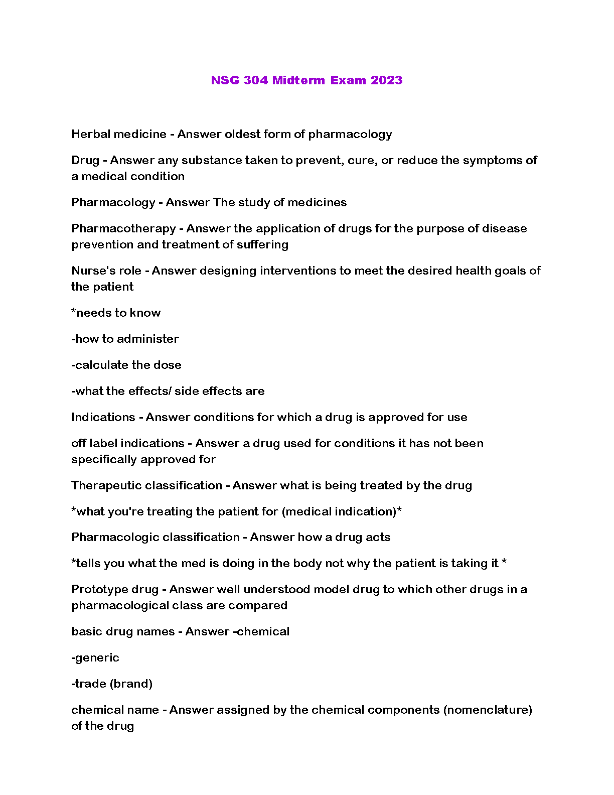 Prepare for your NSG 304 Midterm Exam with confidence! This resource covers crucial concepts, definitions, and key terms related to Pharmacology, ensuring you're well-prepared to succeed on your first try.