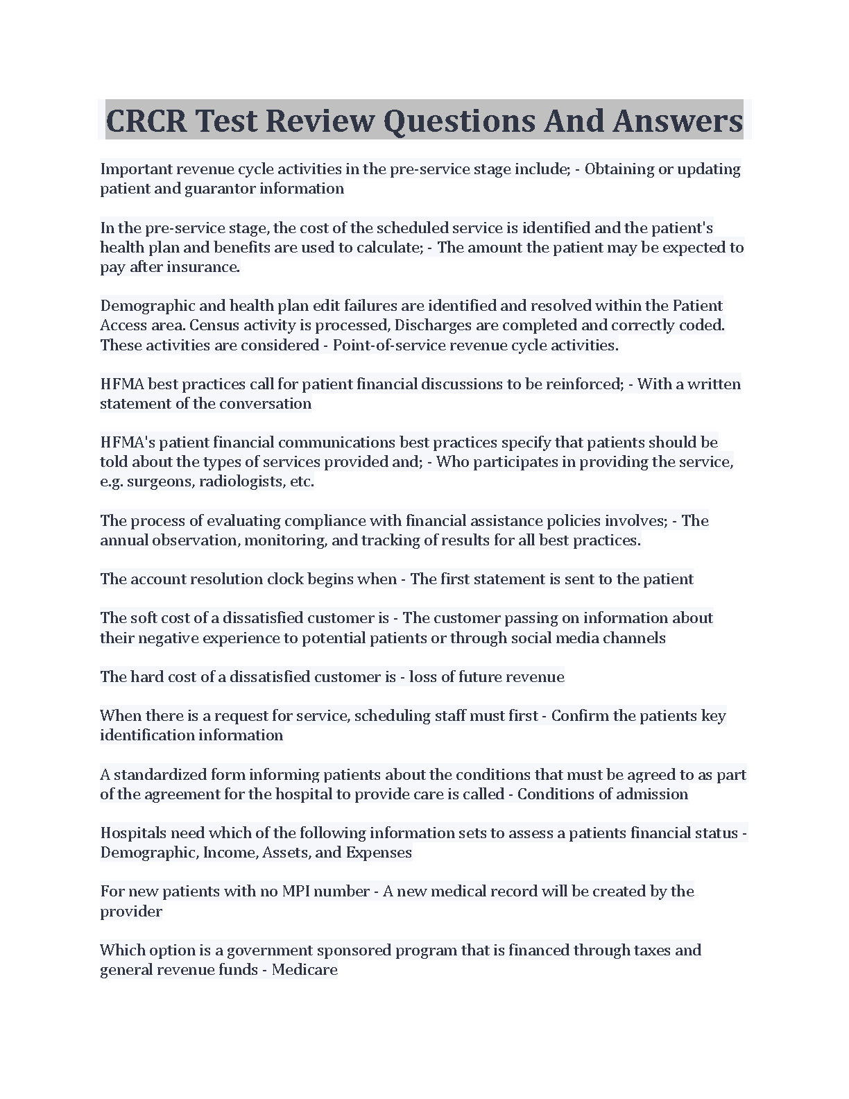 CRCR Test Review Questions and Answers for the 2024/2025 Academic Year: Ace Your Exam and Avoid Resits