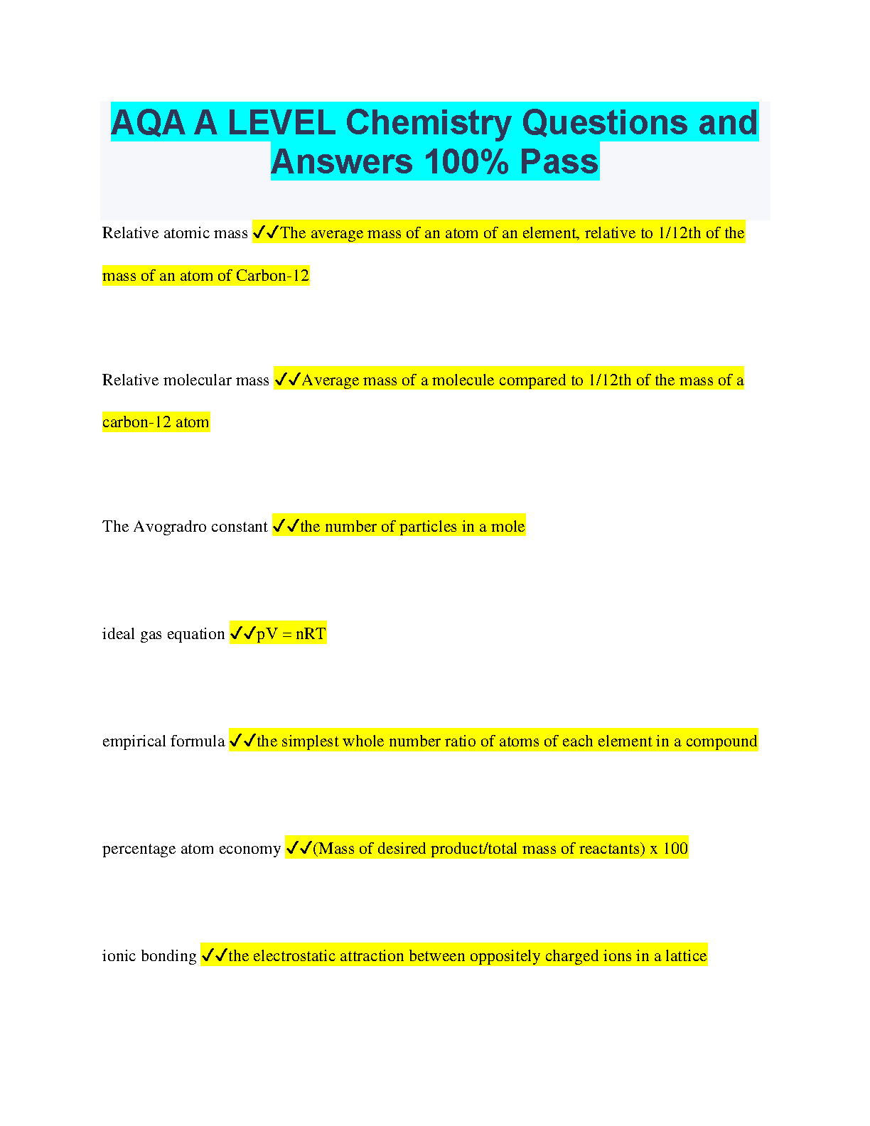 Ace your AQA A Level Chemistry exams with this comprehensive resource. Get access to hundreds of practice questions and answers designed to help you achieve a 100% pass rate. This study guide covers all the key topics and concepts you need to know to succeed in your exams, including definitions, calculations, and real-world applications. Start your preparation today!
