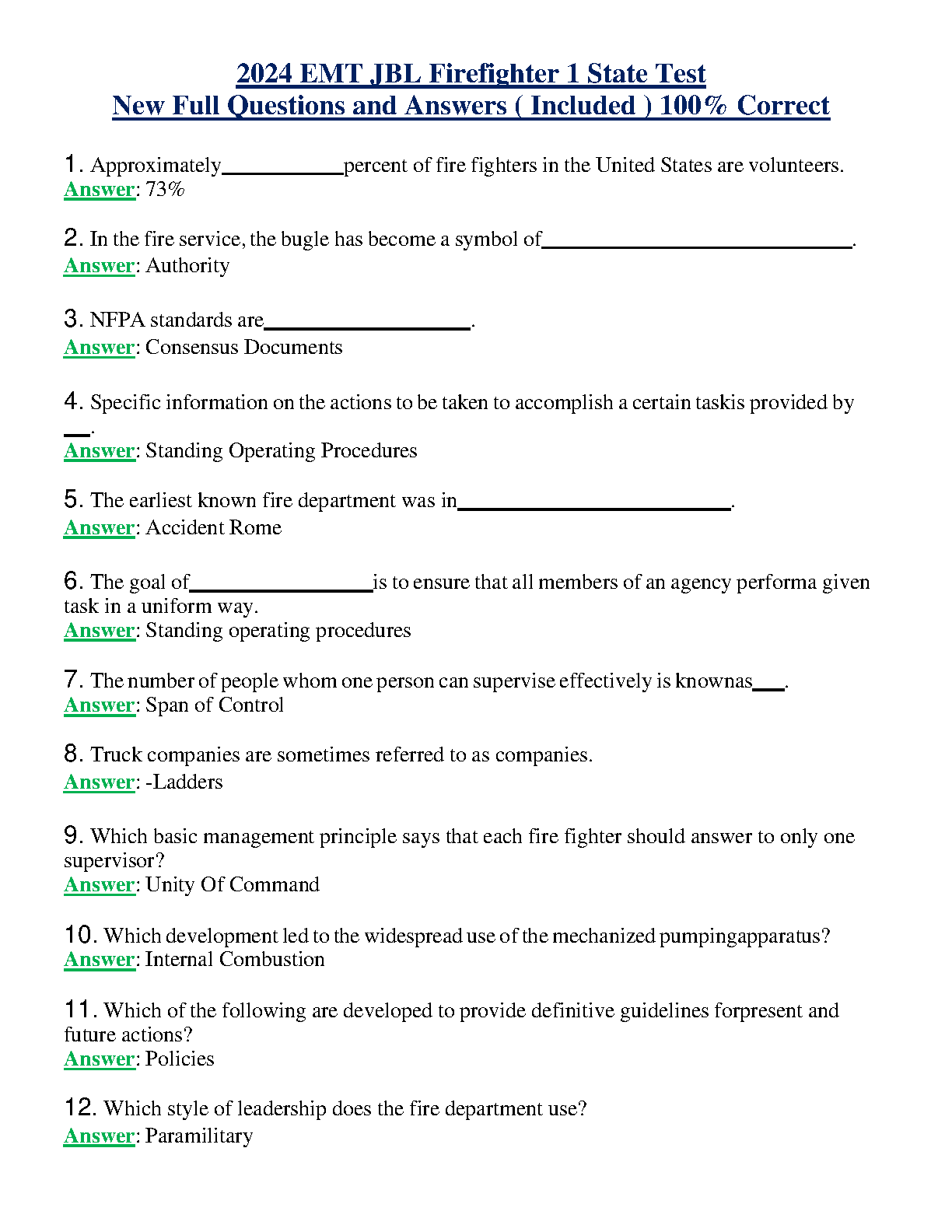 Ace your 2024 EMT JBL Firefighter 1 State Test with this comprehensive study guide! This resource features 100% correct, new full questions and answers, providing a thorough review of all key concepts.