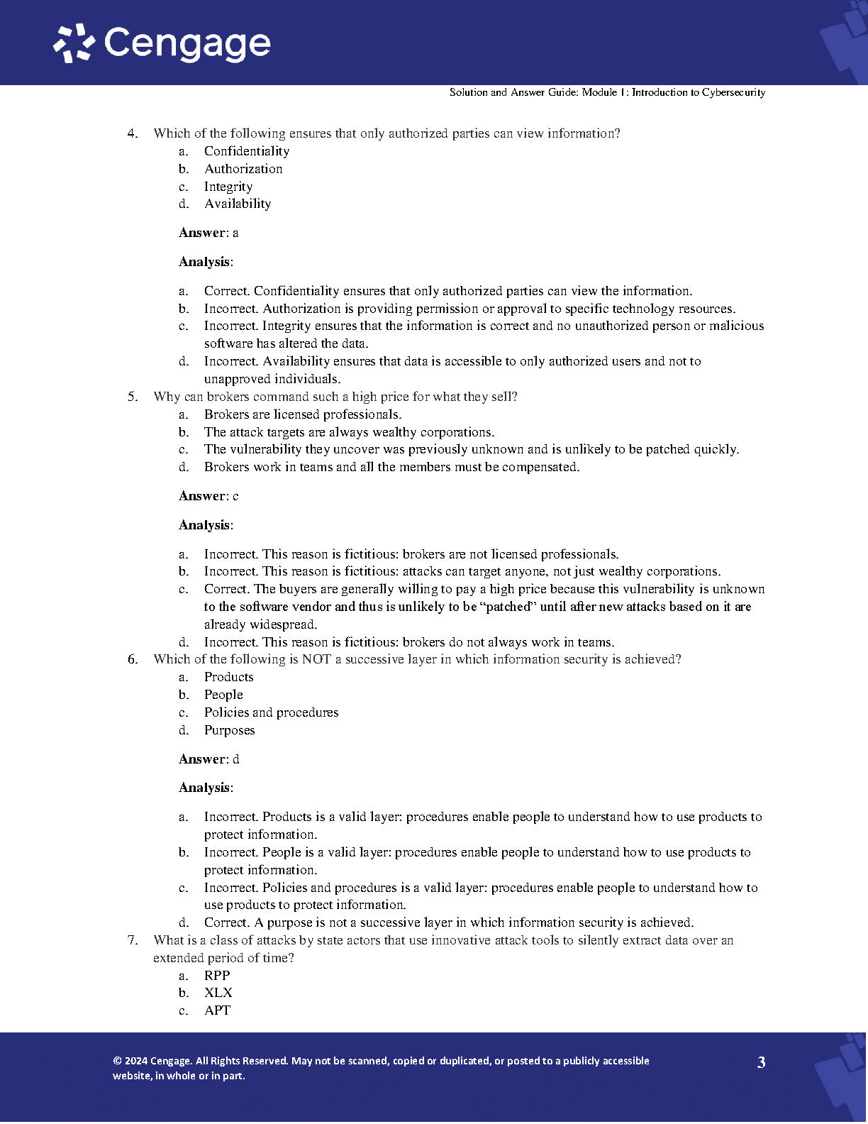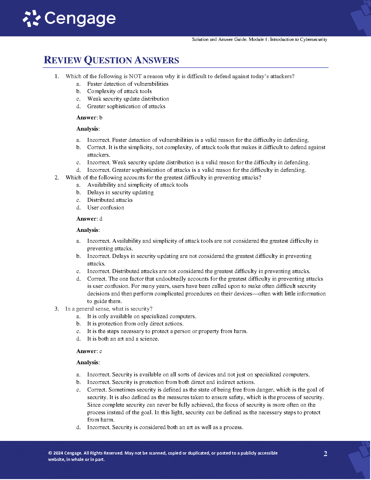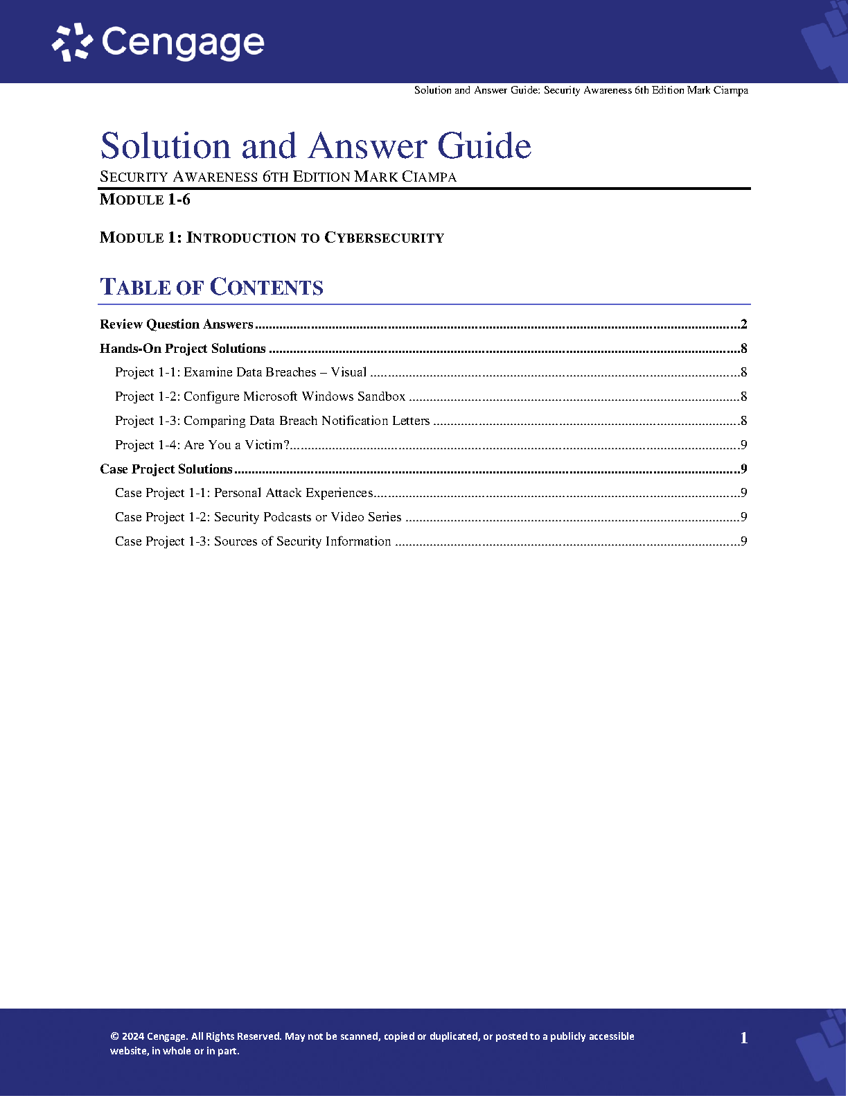 This comprehensive solution and answer guide for the 6th edition of Security Awareness by Mark Ciampa offers detailed answers and solutions to all the questions and projects within the textbook. It is designed to help students understand the concepts and master the skills needed to succeed in the course and pass exams.