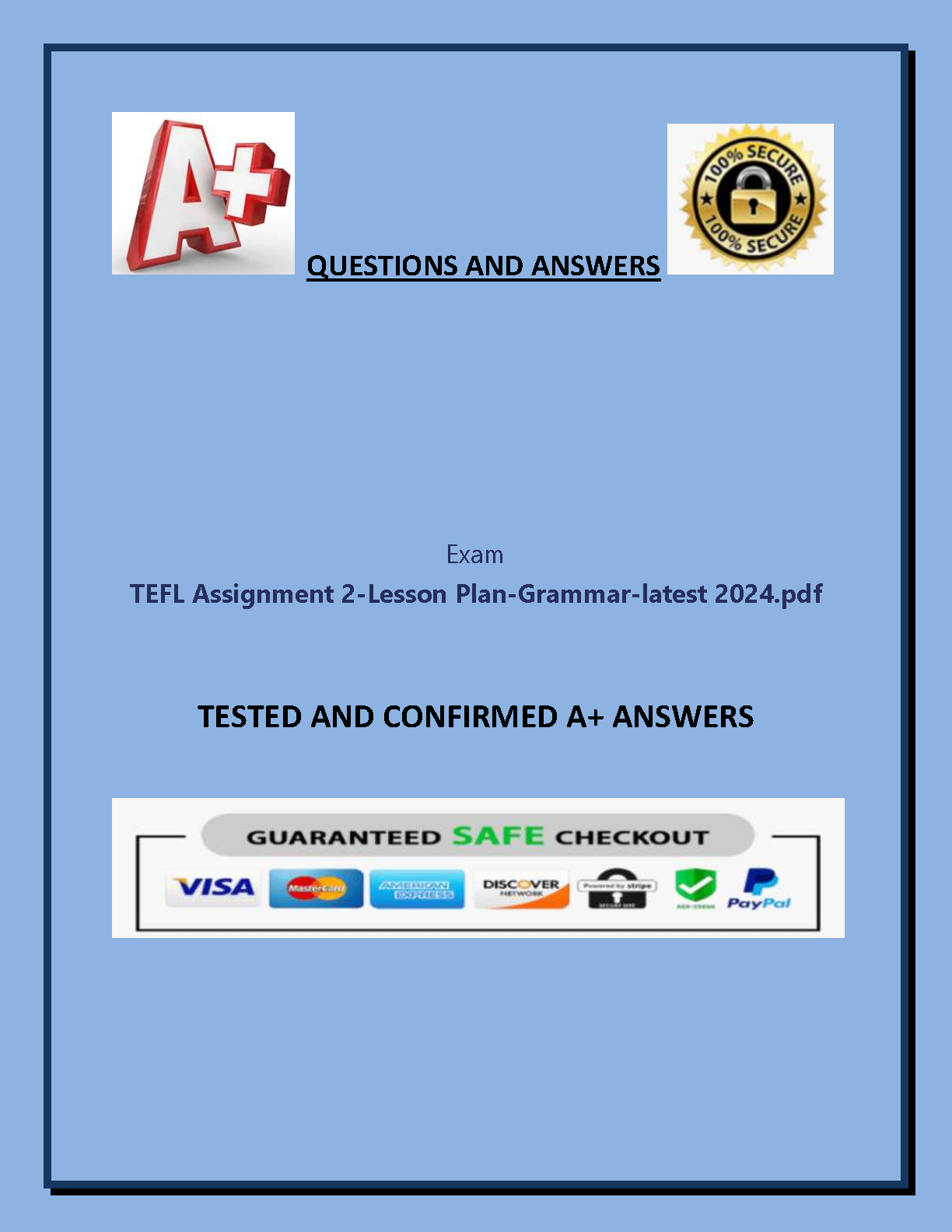 Get the latest TEFL Assignment 2- Lesson Plan-Grammar Questions and Answers for the 2024/2025 academic year. This resource has been designed to help students achieve an A+ grade on their first attempt, avoiding resits. This comprehensive guide provides detailed answers and explanations to all questions, covering all aspects of grammar for the TEFL course.